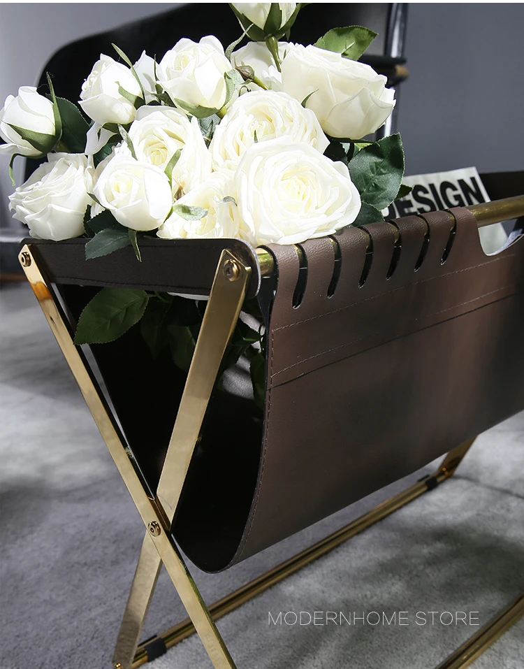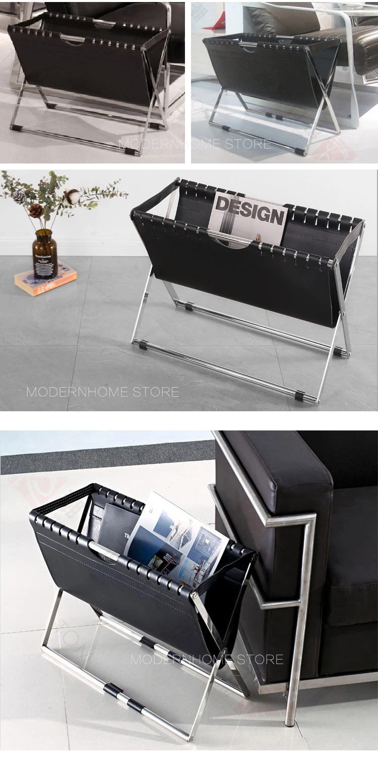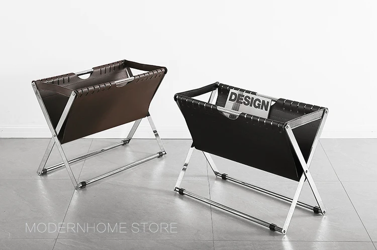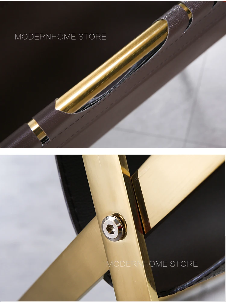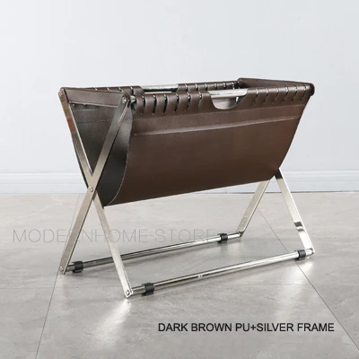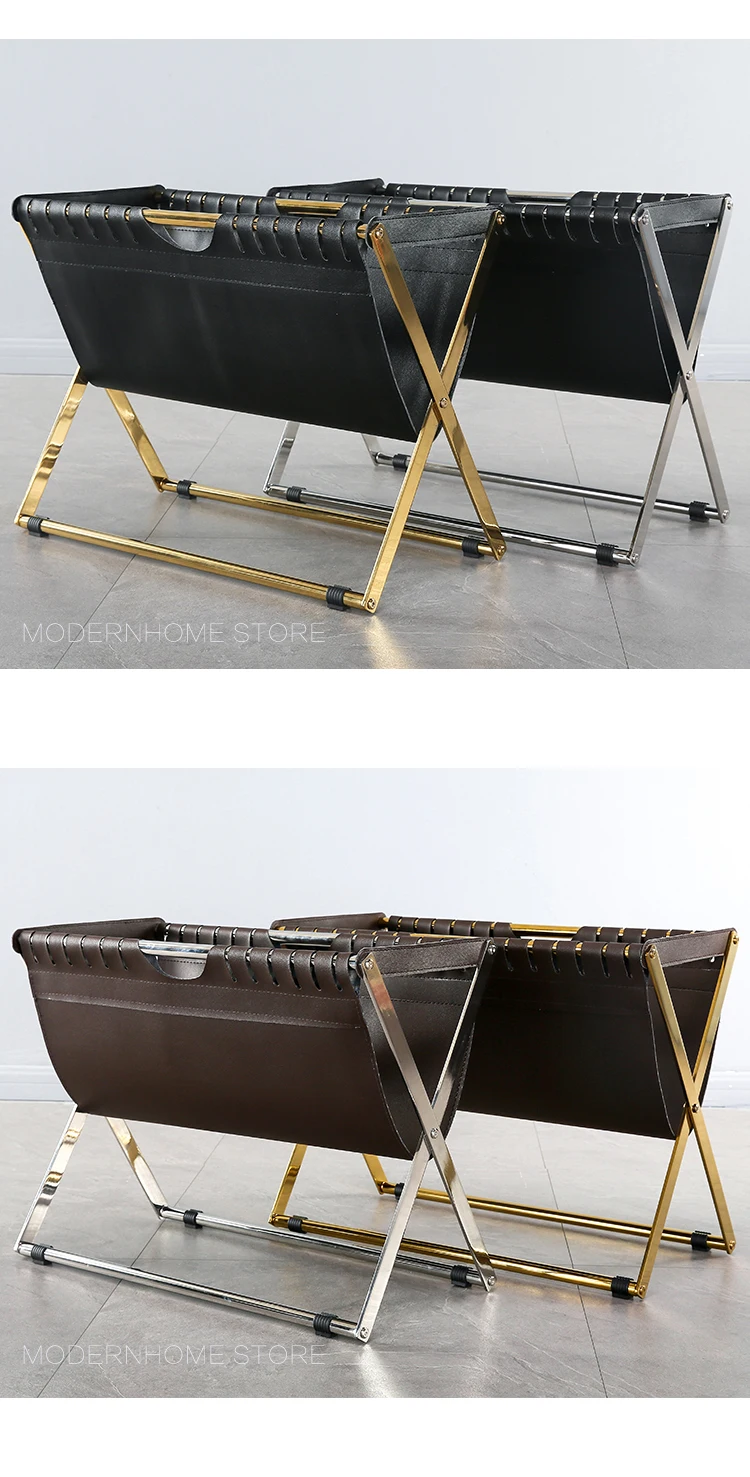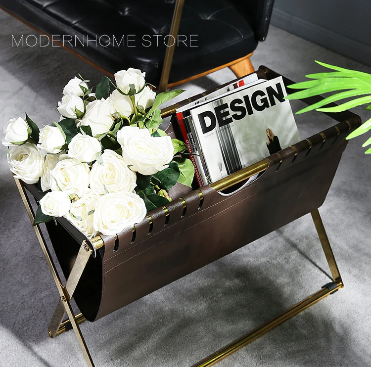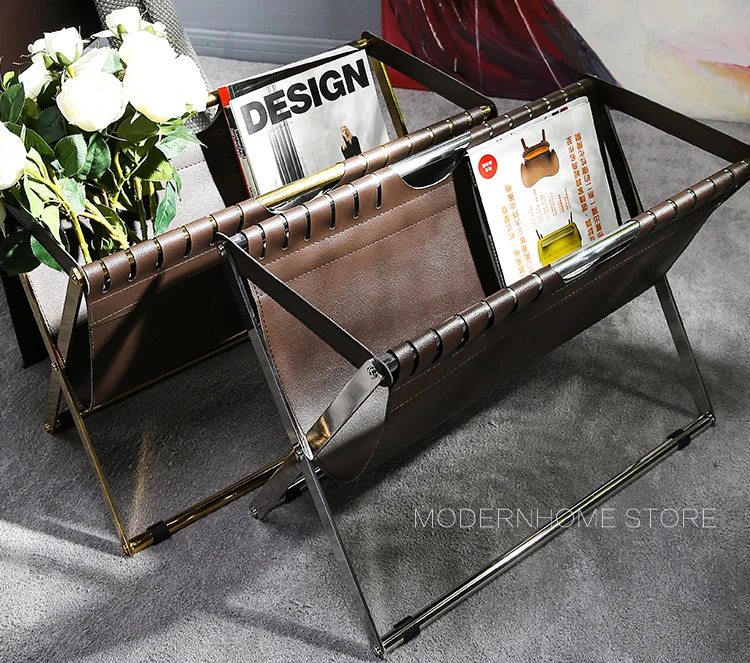 Современный дизайн, модная стойка для журналов Рама из нержавеющей стали Цвет оправы может быть серебристым и золотым Из искусственной кожи Цвет ПУ может быть темно-коричневый и черный Очень красивый дизайн журнальной стойки для вашего современного дома Вам понравится.
