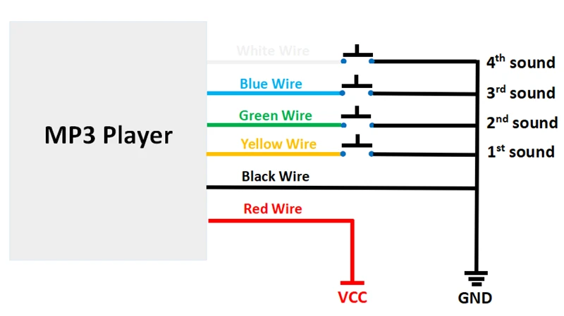 6. Доступно 4 триггерных входа и возможность воспроизведения 4 звуков один на один с помощью отрицательного триггера/отрицательного импульса/GND.
