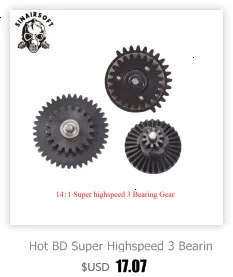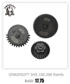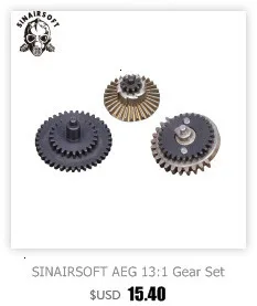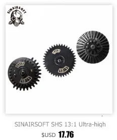 Используется модернизированная стальная шестерня с ЧПУ для замены оригинальной шестерни. Повышает прочность, эффективность и надежность. Это может уменьшить скорость, но начальная скорость на оружие (FPS) значительно увеличилась. Это важная часть обновления коробки передач.