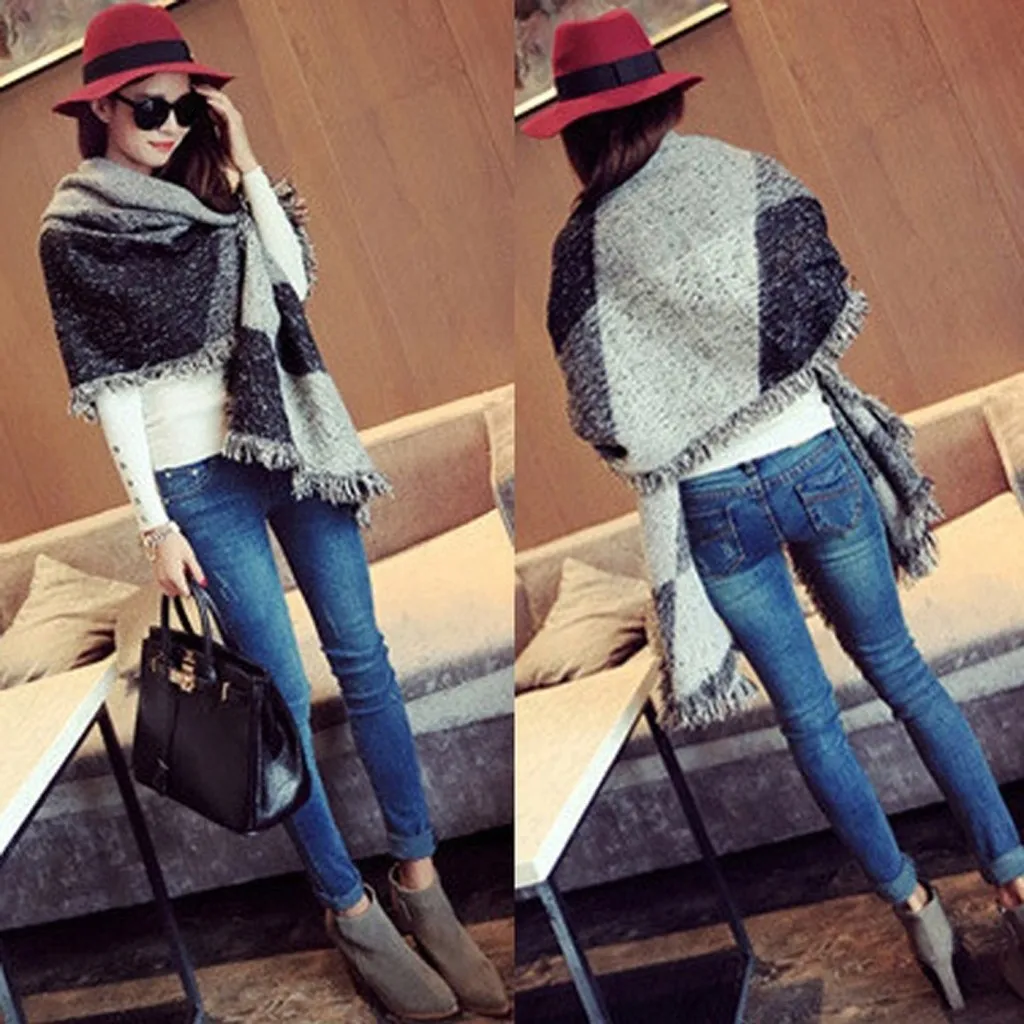 Женские шарфы для женщин зима большой толстый длинный Кашмирской шерсти клетчатых костюмчиков из мягкой ткани; Шарф ретро теплые шалевая накидка с бахромой в виде кисточек клетчатый шарф