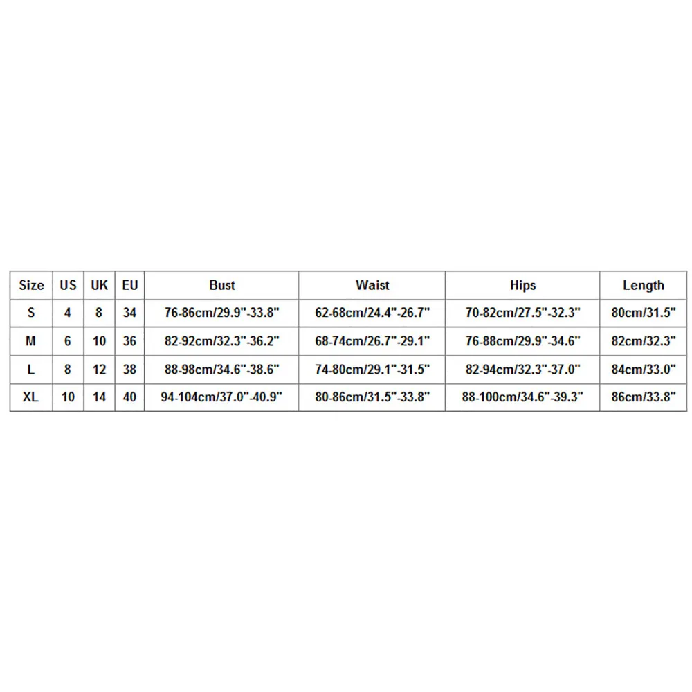 Размеры США Великобритания ЕС Бюст Талия Бедра Длина S 4. 8 34 76-86 см/29,9 "-33,8" 62-68 см/24,4 "-26,7" 70-82 см/27,5 "-32,3" 80 см/31,5" М 6 10 36 82-92 см/32,3 "-36,2" 68-74 см/26,7 "-29,1" 76-88 см/29,9 "-34,6" 82 см/32,3" L 8 12 38 88-98 см/34,6 "-38,6" 74-80 см/29,1 "-31,5" 82-94 см/32,3 "-37,0" 84 см/33,0" XL 10 14 40 94-104 см/37,0 "-40,9" 80-86 см/31,5 "-33,8" 88-100 см/34,6 "-39,3" 86 см/33,8"