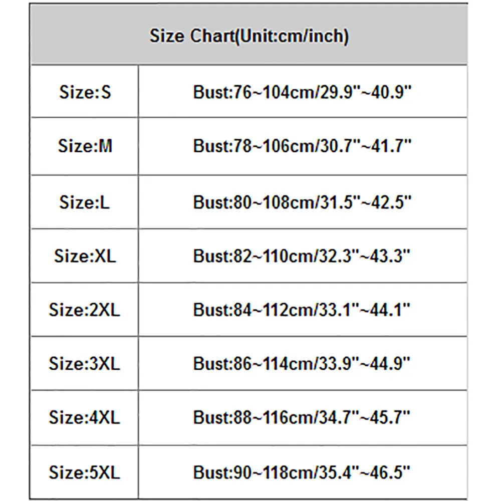Таблица размеров (единица измерения: см/дюйм) Размер: S Бюст: 76 ~ 104 см/29,9 "~ 40,9" Размер: M Бюст: 78 ~ 106 см/30,7 "~ 41,7" Размер: L Бюст: 80 ~ 108 см/31,5 "~ 42,5" Размер: XL Бюст: 82 ~ 110 см/32,3 "~ 43,3" Размер: 2XL Бюст: 84 ~ 112 см/33,1 "~ 44,1" Размер: 3XL Бюст: 86 ~ 114 см/33,9 "~ 44,9" Размер: 4XL Бюст: 88 ~ 116 см/34,7 "~ 45,7" Размер: 5XL Бюст: 90 ~ 118 см/35,4 "~ 46,5"