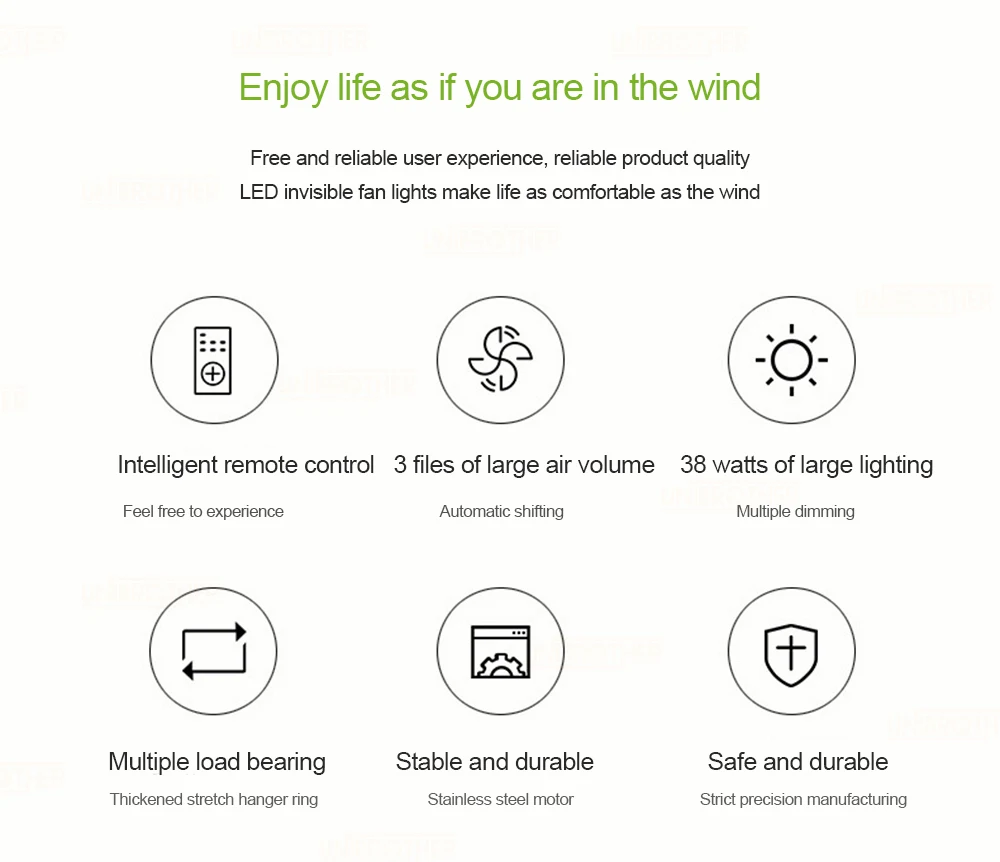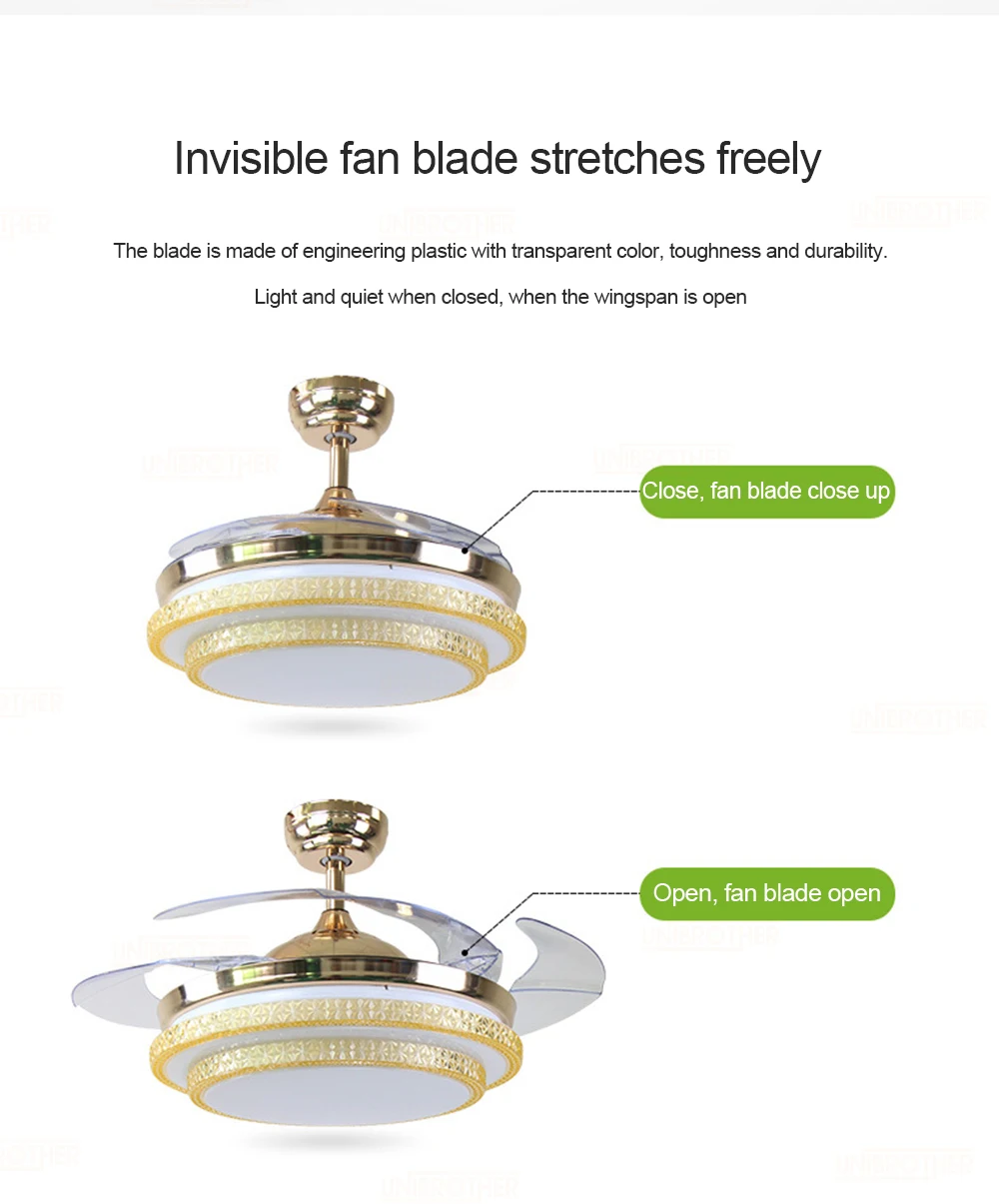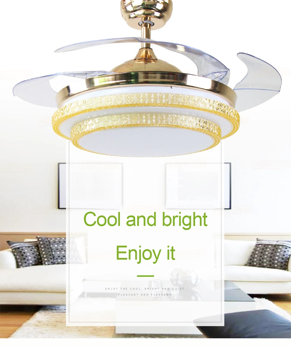 Бесплатный и надежный пользовательский опыт, надежное качество продукции, светодиодные невидимые фонари вентилятора делают жизнь такой же удобной, как и интеллектуальный пульт дистанционного управления ветром, 3 файла большого объема воздуха 38 Вт большого освещения, множество подшипников нагрузки стабильны и долговечны, безопасны и долговечны