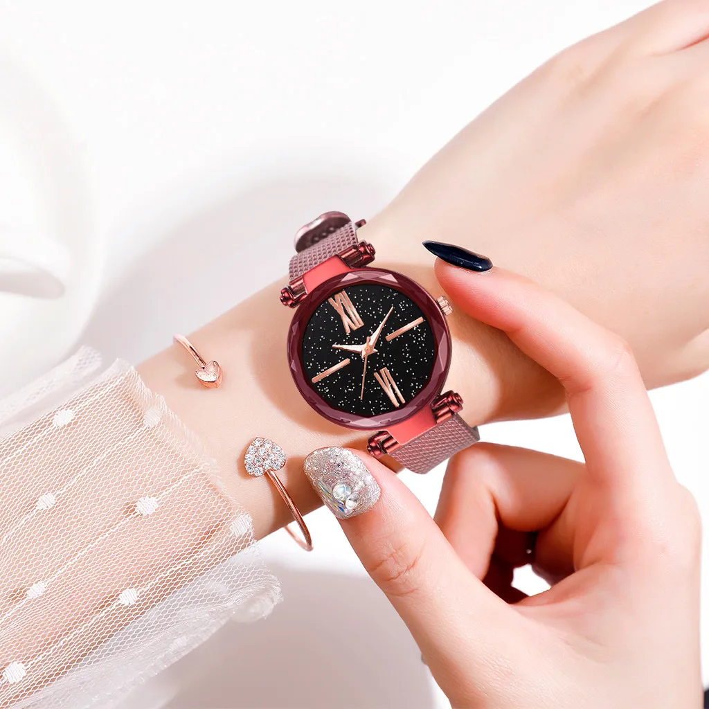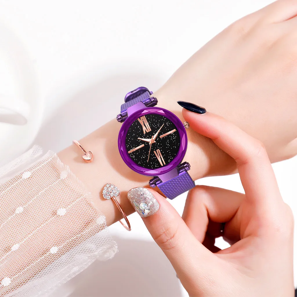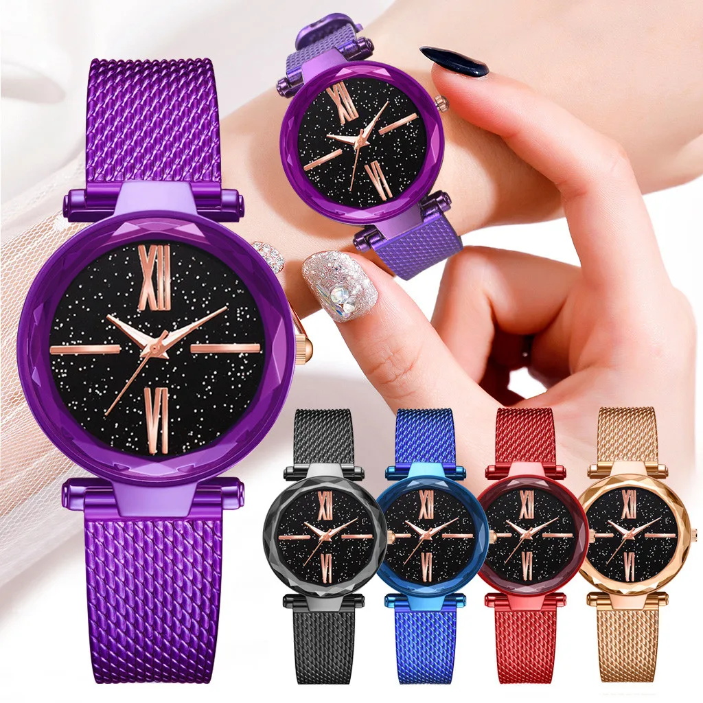 Модные Простые крутые большие римские цифровые Звездные небесные циферблаты женские сетчатые с кварцевыми часами