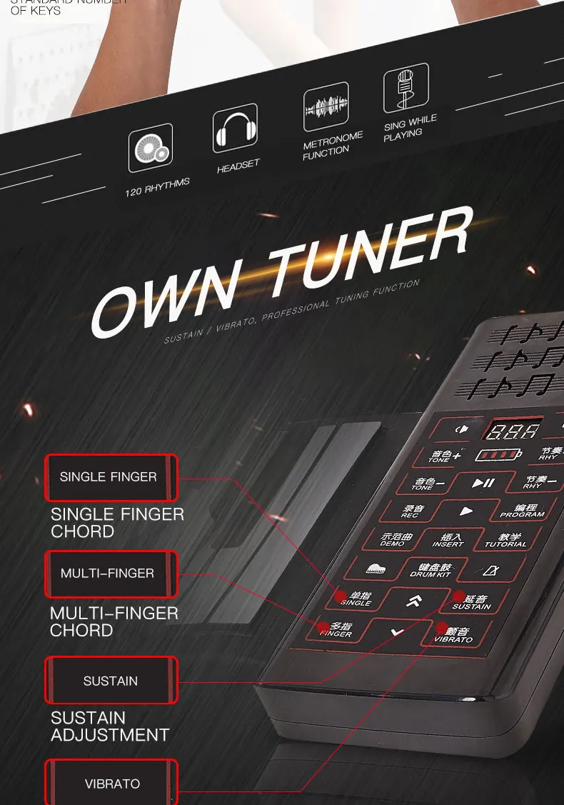 Это пианино имеет 128 отличных тонов и оснащено 128 ритмами, 15 демонстрациями и 64 аккордами, может записывать и проигрывать Badk, имеет эхо, трил и продолжение аккорд, подходит для обучающихся и любимых.