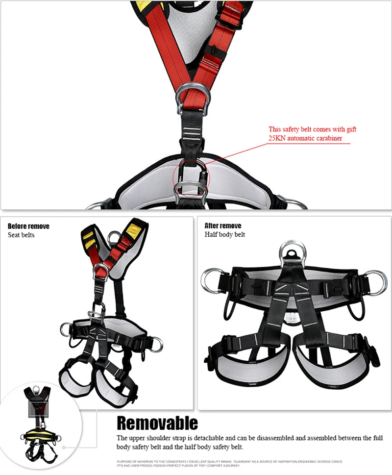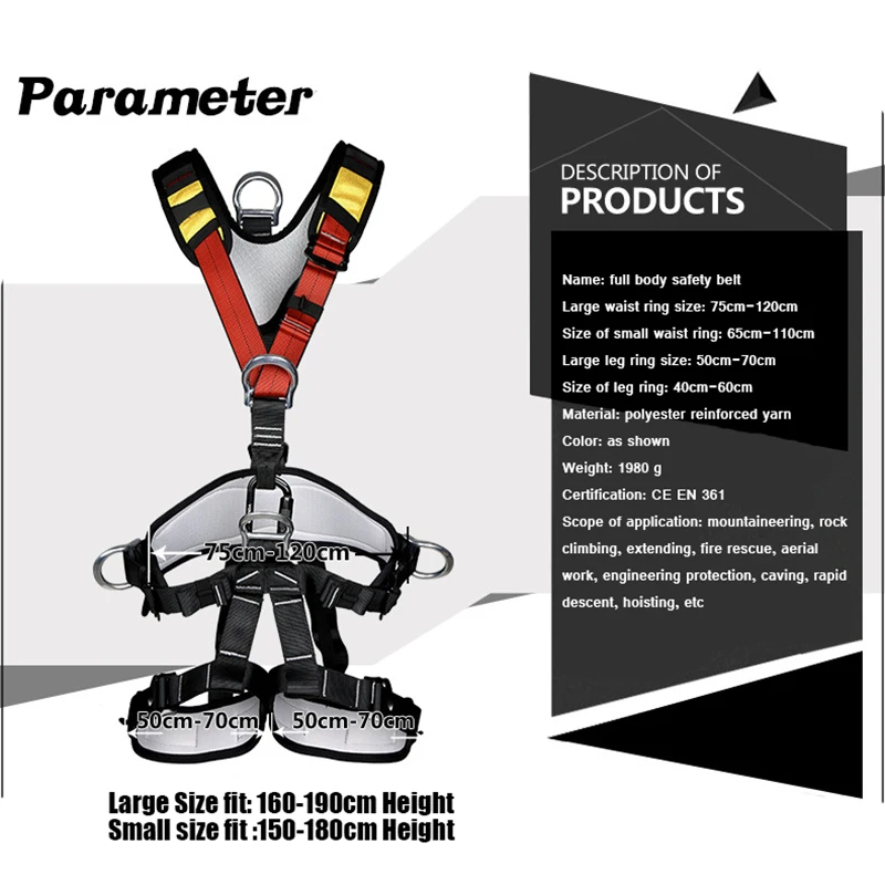 Атрибут товара Номер изделия: XD - A9516 Полное название: ремень безопасности всего тела Размер большого поясного кольца: 75-120 см Маленький размер поясного кольца: 65-110 см Размер большого кольца для ног: 50-70 см Размер кольца для маленьких ног: 40-60 см Материал: полиэстер армирующий шелк Цвет: как показано на рисунке Вес: 1980 г Стандарт продукта: CE EN361 Область применения: альпинизм и скалолазание, расширение, пожарное спасение, Воздушная работа, инженерная защита, разведка отверстий, спуск, подъем и т. д. Подходящий рост для больших размеров: 160-190 см Подходящий рост для маленьких размеров: 150-180 см