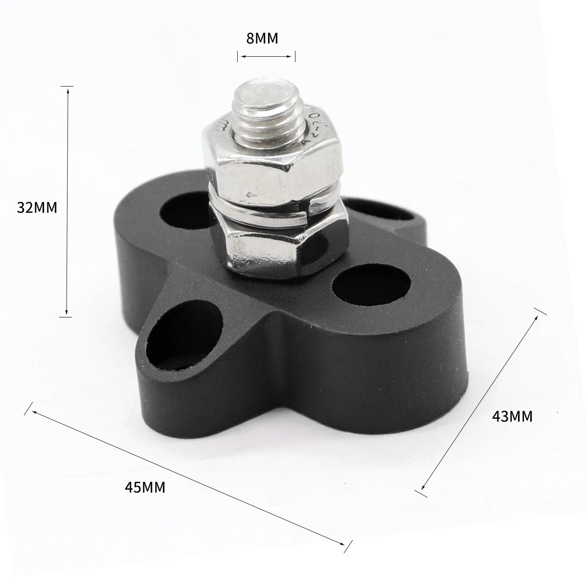 Base Material | Nylon, Glass Fiber reinforced Max Operating Voltage | DC 48V Max Amp per circuit | Determined by wires connected Stud Size:1 x M8 (5/16") Packing list: M8 Terminal Studs *1 ,screws*2 1. The base is made of flame retardant plastic to protect your safety. 2. Suitable for trucks, RVs, coaches, boats, etc. Installation method: surface screw fixed installation