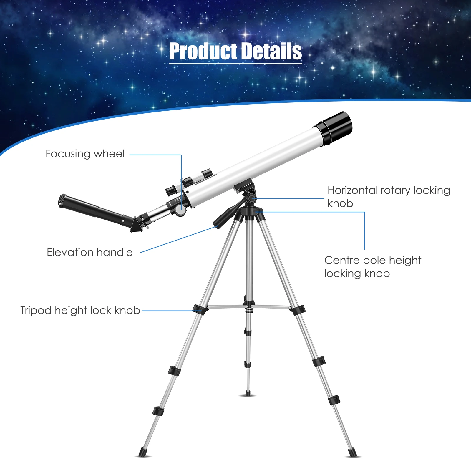 Описание: Регулировочный стержень используется для регулировки угла телескопа, который может осуществлять вращение на 360 ° во всех направлениях. При наблюдении за солнцем необходимо использовать солнцезащитный фильтр и носить защитные очки для защиты очков от вреда. Штатив изготовлен из алюминиевого сплава, который является светильник и прочный. Нескользящая подкладка для ног в нижней части подходит для различных погодных условий. Интерфейс камеры может быть подключен к камере для использования, и камера будет удерживаться под большим весом и снижена во время использования.