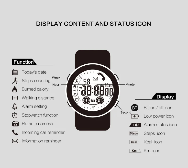 *** FSTN экран-чем крепче светильник, тем ярче экран. (видимый на солнце светильник) *** Цифровые спортивные часы-запись спортивных данных, точно записывает 24 часа шагов, ходьбы, потребление сжиженных калорий, чтобы помочь вам понять спортивную выгоду в режиме реального времени. Таймер обратного отсчета и сигнал тревоги регулируют план упражнений. Хранит спортивные данные за последние 15 дней, старые данные будут покрываться циклически. Приложение и фоновый сервер поддерживают всемирную сеть, вы можете поделиться с вашим другом и проверить рейтинг. *** Многофункциональные BLUETOOTH Смарт-часы-сегодня дата, светящийся циферблат, шаги, ходьбы, сжигаемые калории, настройка будильника, функция секундомера, удаленная камера предлагает вам делать фотографии в каждом месте. Значок вызова и сообщения постоянно мерцает и издает Сигнал уведомления «Звуковой сигнал», чтобы напоминать. Примечание: сообщение включает SMS, Facebook, Skype, Twitter, Whatsapp, Wechat. *** Совместимость с ANDROID/IOS-легко подключается к телефону. Загрузите приложение, подключите через Bluetooth 4,0 для просмотра данных о движении в реальном времени и мгновенного обмена спортивными данными в социальных сетях. Лучший электронный подарок для мужчин и мальчиков. Примечание: приложение поддерживает IOS7.0 или выше версии и Android 4,3 или выше версии. *** Нет необходимости заряжать-эти Смарт-часы встроены в 1 шт. CR2450 литиевая батарея с 610 мАч высокой емкости, часы работают в течение 14 месяцев срок службы батареи при нормальном использовании, 33 месяца работы батареи в энергосберегающем режиме без зарядки. Примечание: аккумулятор CR2450 легко купить и заменить. *** Прочные и удобные 5 АТМ водонепроницаемые Смарт-часы-прецизионный Процесс ламинирования, анти-пот нано TPE материал ремешок для часов, очень Утяжеленный светильник, и мягкий ремешок для часов удобен в носке. Уникальный водонепроницаемый дизайн, хорошо подходит для активного отдыха. 5 атм водонепроницаемый только для ежедневного использования, мытья рук, принятия ванны, плавания, но не для дайвинга. Примечание: Не нажимайте кнопки под водой и не кладите в горячую воду. Специальный Feacutes: Языки приложения: английский, французский, итальянский, немецкий, русский, испанский, португальский, японский, арабский, корейский. Функция s: сегодня дата, подсчет шагов, сжигание калорий, ходячие калории, настройка будильника, функция секундомера, удаленная камера, напоминание о входящем звонке, напоминание информации (SMS, Facebook, Twitter, Skype,, WhatsApp, WeChat) Данные часов: Сохраните данные за последние 15 дней. Способ подключения: Шаг 1: пожалуйста, нажмите S1, чтобы включить Bluetooth умных часов. Шаг 2: откройте приложение на телефоне для подключения Bluetooth. Уведомление: Пожалуйста, не подключайте Bluetooth напрямую к мобильному телефону. Если вы по ошибке Подключите Bluetooth к мобильному телефону, пожалуйста, отмените Подключение Bluetooth. Вопросы и ответы В. Как называется приложение? А. "Sports +", Вы можете скачать его в google play (Android) или app store (IOS). В. Какой язык часов? А. Сами часы не имеют языка, но приложение поддерживает английский, русский, испанский, итальянский, португальский, немецкий, французский, японский, корейский, арабский. В. Есть ли у часов вибрационная функция? А. Нет, только звуковой сигнал.