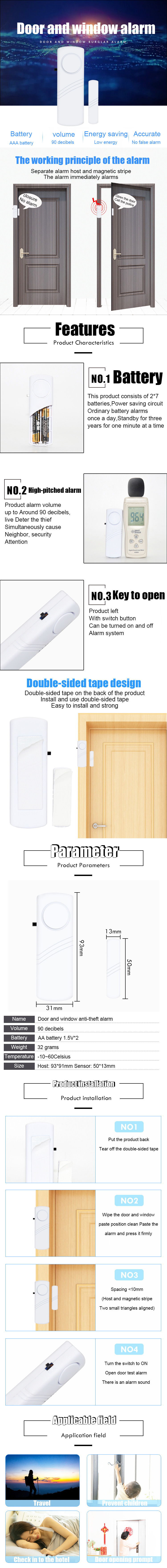 Изделие маленькое и изысканное, легко устанавливается, а Двухсторонняя клейкая лента легко устанавливается на дверь или окно. Это дешевая, Экономичная и практичная техническая профилактическая мера. В нашей местности мы были полностью подтверждены жителями и полицейскими. Просто прикрепите основные и вспомогательные детали к дверной и дверной раме или к двум окнам и выровняйте их (левый зазор 5 мм). Как только вор захлопывает дверь, захлопывает окно, старается украсть (основные и вспомогательные части отделены), сигнал тревоги может звучать сильный сигнал тревоги, отпугивает вора, напомните владельцу и окружающим его людям, чтобы поймать вора. Когда вы хотите открыть дверь или окно, вы можете управлять им с помощью переключателя. Подходит для предотвращения краж жилых домов, офисов, счетчиков магазинов и т. д.