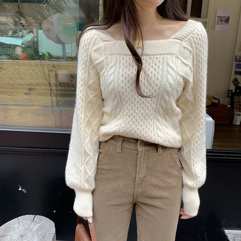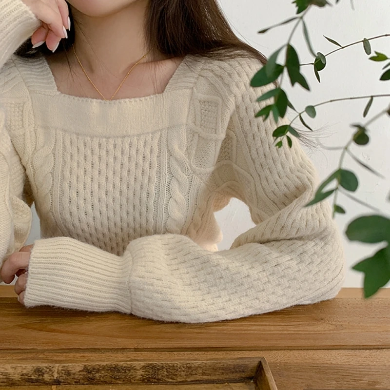 Название:RealShe, топы, свитера для женщин, квадратный воротник, длинный рукав, однотонный вязаный свитер, Женский пуловер, весенний Повседневный пуловер для женщин