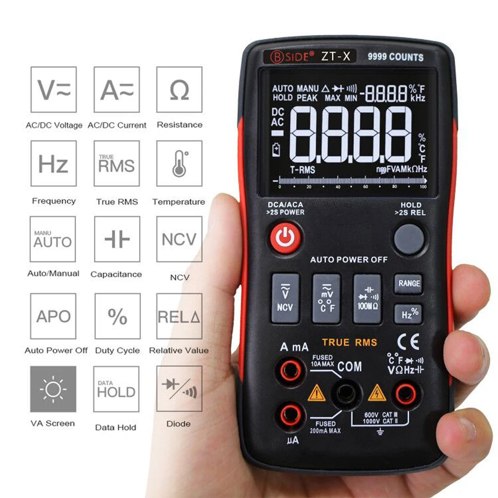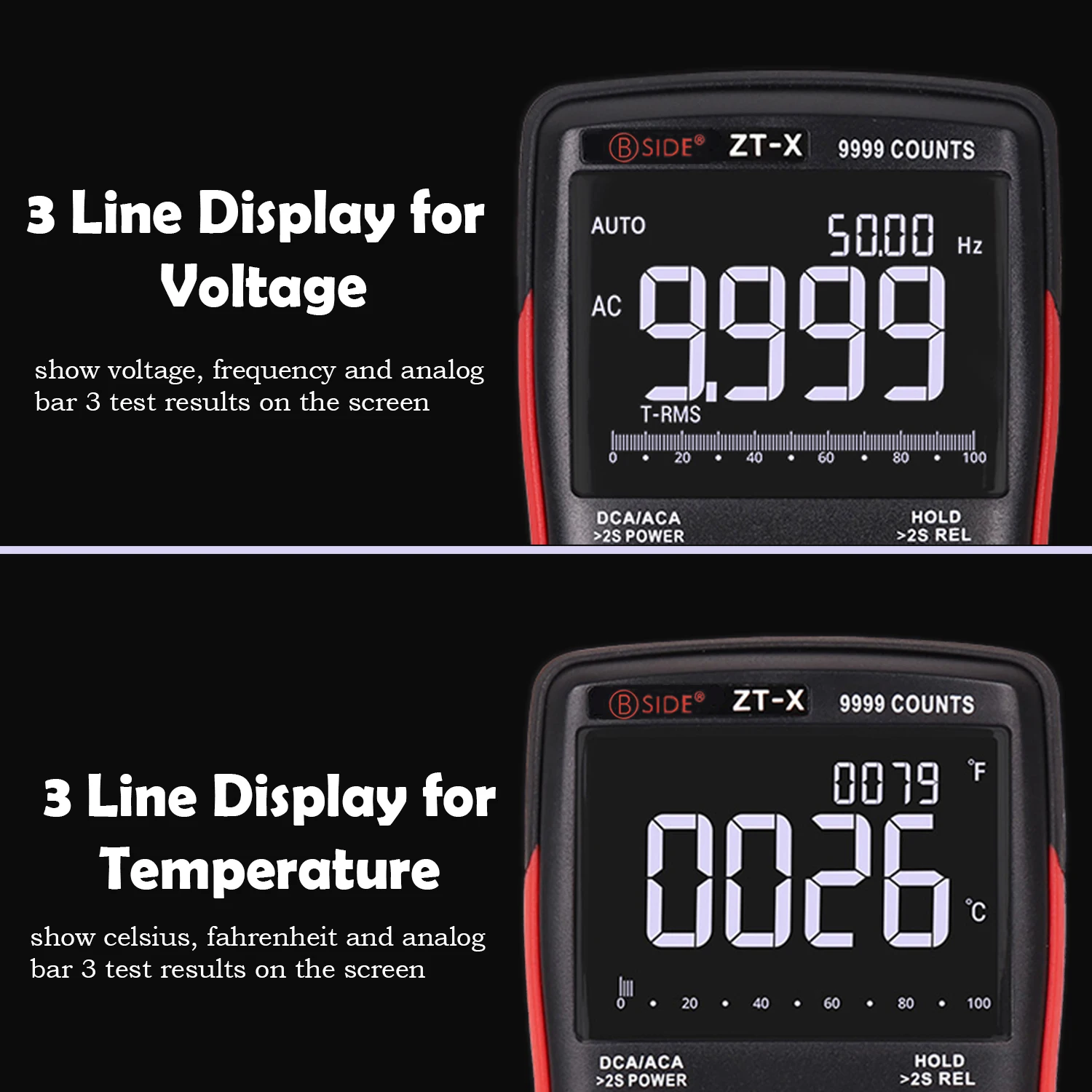 [EBTN LCD Display Technology]: EBTN (enhanced background twisted nematic) LCD display greatly enhance the reading experience, the lighted up numbers & letters with black background make it very easy to read, even in bright sunlight or poor light. [Large Screen 3 Line Display]: Large screen triple line display can show 3 test results on the screen, such as voltage, frequency and analog bar. [All Button Design]: All button (no switch) design for easy single-hand operation, switching function is fast and convenient. [9999 Counts True RMS Multimeter]: This 9999 counts TRMS auto-ranging multimeter can measure temperature, capacitance, diode, continuity, NCV (non-contact voltage detection), Ohm, Hz, duty cycle, AC/ DC voltage, AC/DC current, etc. [Protective Case]: It features a protective case for protection against shocks, friction and bumps.