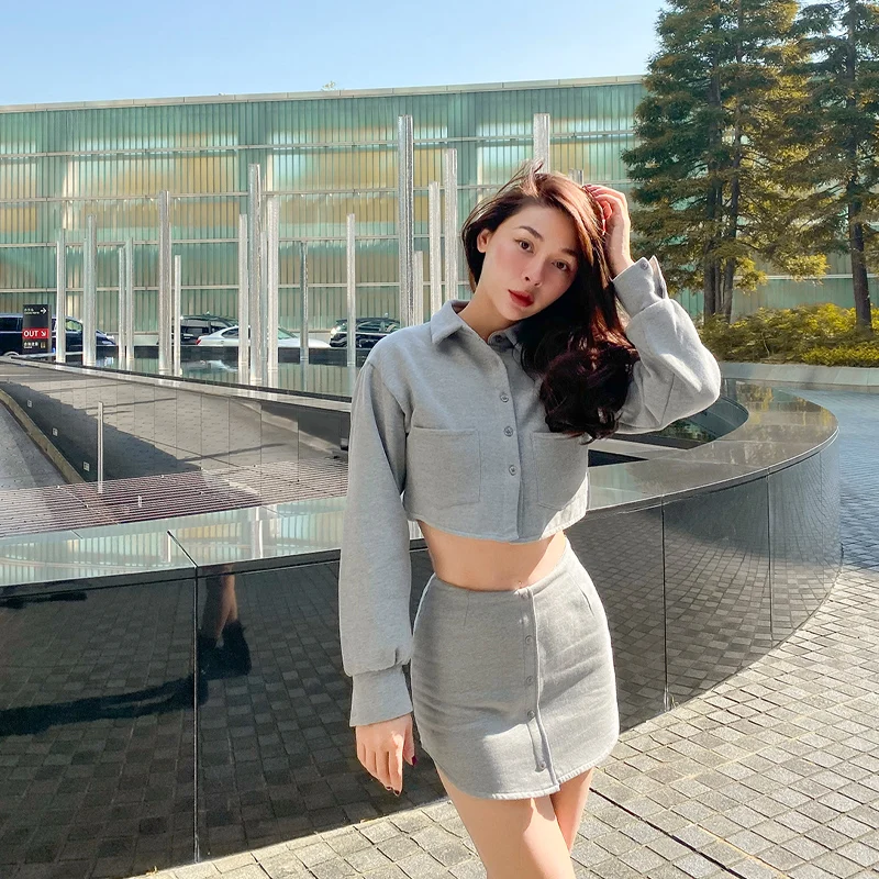 Женский комплект из 2 предметов, модный серый свитшот с мягким ворсом, короткий топ и мини-юбка с высокой талией, зима 2019