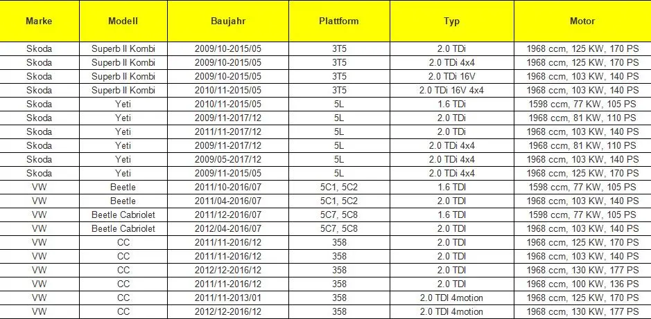 Technical details Voltage: 12V Operating mode: electrical Vehicle Equipment: for vehicles with diesel engine reference HWP0043 5N0965561A 5N0 965 561 A V10-16-0014 99651619101 8600 29077 7500052 use Audi A3 8P1 (year 2003-2012) Hatchback Audi A3 Cabriolet 8P7 (year 2008-2013) Cabriolet Audi A3 Sportback 8PA (year 2004-2013) hatchback Audi A4 8K2, B8 (YOM 2007-2015) Saloon Audi A4 Allroad 8KH, B8 (year 2009-2016) estate Audi A4 Avant 8K5, B8 (year 2007-2015) Estate Audi A5 8T3 (year 2007-2017) coupe Audi A5 Cabriolet 8F7 (Bj. 2009-2017) Cabriolet Audi A5 Sportback 8TA (Bj. 2009-2017) Hatchback Audi A6 4G2, C7, 4GC (YOM 2010-2018) Saloon Audi A6 4G2, C7 (YOM 2010-2018) Saloon Audi A6 Avant 4G5, C7 (built 2011-2018) estate Audi A6 Avant 4G5, 4GD, C7 (built 2011-2018) estate Audi Q3 8U (built 2011-2018) Off-road vehicle closed Audi Q5 8R (built 2008-2017) SUV closed Audi TT 8J3 (Bj. 2006-2014) Coupe Audi TT Roadster 8J9 (year 2007-2014) Cabriolet Seat Alhambra 710, 711 (YOM 2010-2015) MPV Seat Alhambra 710 (built 2010-2018) MPV Seat Alhambra 710 (built 2010-2015) MPV Seat Altea 5P1 (built 2004-2018) MPV Seat Altea XL 5P5, 5P8 (YOM 2006-2018) MPV Seat Exeo 3R2 (YOM 2008-2013) Saloon Seat Exeo ST 3R5 (YOM 2009-2018) Estate Seat Leon 1P1 (YOM 2005-2012) Hatchback Skoda Octavai II 1Z3 (YOM 2004-2013) Hatchback Skoda Octavia II 1Z3 (YOM 2004-2013) Hatchback Skoda Octavia II Combi 1Z5 (year 2004-2013) Estate Skoda Superb II 3T4 (YOM 2008-2015) Hatchback Skoda Superb II Estate 3T5 (Yom 2009-2015) Estate Skoda Yeti 5L (built 2009-2018) Off-road vehicle closed VW Beetle 5C1 (YOM 2011-2018) Hatchback VW Beetle Cabriolet 5C7 (built 2011-2018) Cabriolet VW Caddy III Box 2KA, 2KH, 2CA, 2CH (YOM 2004-2015) Box VW Caddy III estate 2KB, 2KJ, 2CB, 2CJ (year 2004-2015) Estate VW CC 358 (Bj. 2011-2016) Coupe VW EOS 1F7, 1F8 (year 2006-2015) Cabriolet VW Golf Plus 5M1, 521 (year 2005-2013) hatchback VW Golf V Estate 1K5 (year 2007-2009) Estate VW Golf VI 5K1 (YOM 2008-2013) Hatchback VW Golf VI Convertible 517 (built 2011-2018) Cabriolet VW Golf VI Estate AJ5 (year 2009-2013) estate VW Jetta III 1K2 (YOM 2005-2010) Saloon VW Jetta IV 162, 163 (YOM 2010-2018) Saloon VW Jetta IV 162 (YOM 2010-2018) Saloon VW Passat 3C2 (year 2005-2010) notchback VW Passat 362 (Bj. 2010-2014) notchback VW Passat Alltrack 365 (built 2012-2014) estate VW Passat CC 357 (year 2008-2012) Coupe VW Passat Estate 3C5 (year 2005-2011) estate VW Passat Estate 365 (built 2010-2014) estate VW Scirocco 137 (Bj. 2008-2018) Coupe VW Sharan 7N1, 7N2 (built 2010-2018) MPV VW Sharan 7N (built 2010-2018) MPV VW Tiguan 5N_ (built 2007-2018) SUV closed VW Tiguan 5N_ (built 2007-2015) Off-road vehicle closed VW Tiguan 5N_ (built 2007-2011) SUV closed VW Touran 1T3 (built 2010-2015) MPV VW Touran 1T1, 1T2 (Bj. 2003-2010) MPV VW Transporter V Bus 7HB, 7HJ, 7EB, 7EJ, 7EF, 7EG, 7HF, 7EC (built 2003-2015) Bus VW Transporter V Box 7HA, 7HH, 7EA, 7EH (YOM 2003-2015) boxWhen you place an order, please choose a shipping method and pay for the order including the shipping fee. We will send the items within 7 days once your payment is completed. All items are checked and tested carefully by our technical department before shipping.All items are checked and tested carefully by our technical department before shipping. Therefore, please make sure there is no damage before signing the parcel. If there is, please have it recorded with the courier and file a claim from logistics. In case the courier refuses to open the parcel, you can refuse to sign.Thanks for your understanding and cooperation! We do not uarantee delivery time on all international shipments due to differences in customs clearing times in individual countries, which may affect how quickly your product is inspected. Please note that buyers are responsible for all additional customs fees, brokerage fees, duties, and taxes for importation into your country. These additional fees may be collected at time of delivery. We will not refund shipping charges for refused shipments.
