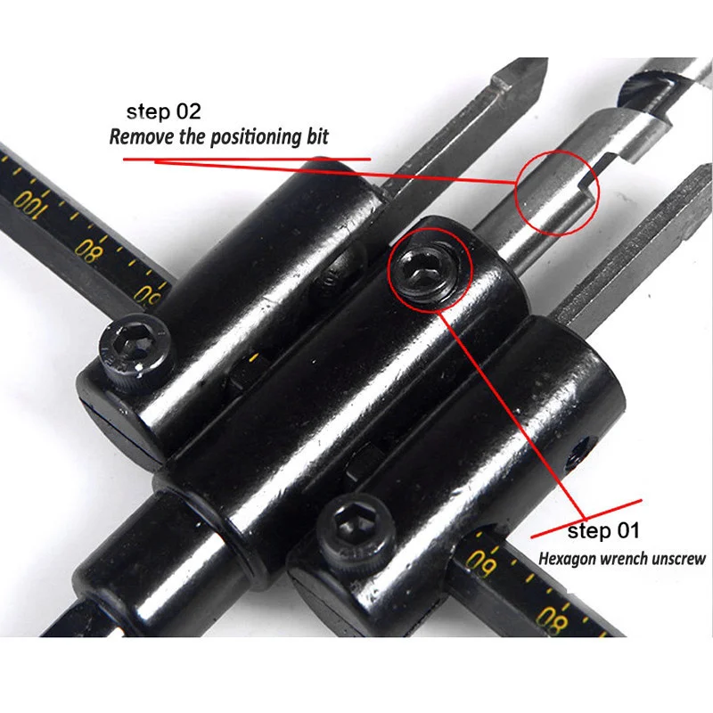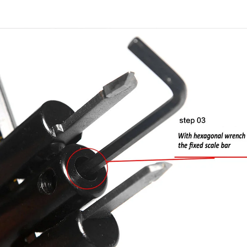 3. Установите два держателя лезвий в желаемом градуировании на измерительной планке, плотно закрутив шестигранные гайки с помощью L-образного шестигранного ключа.