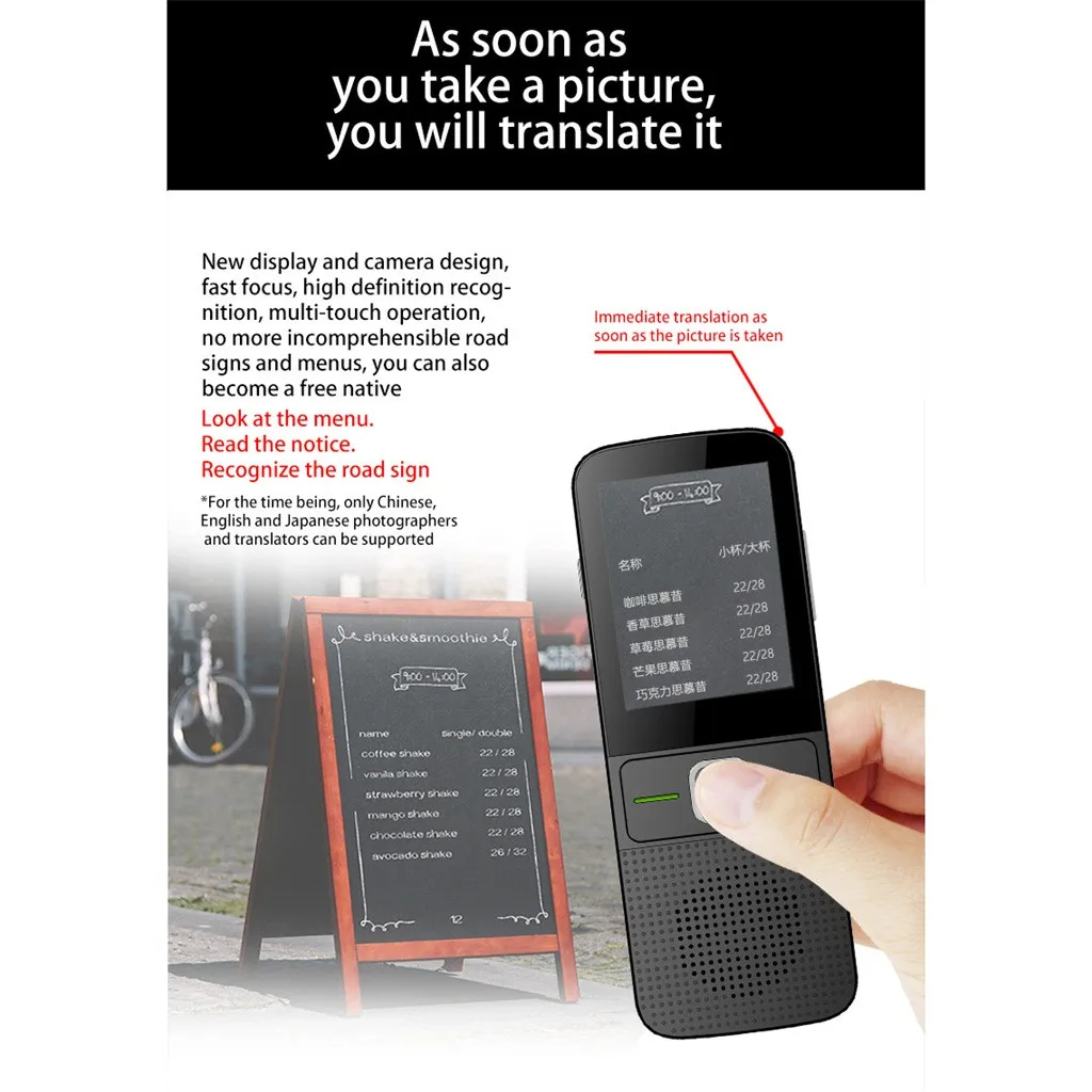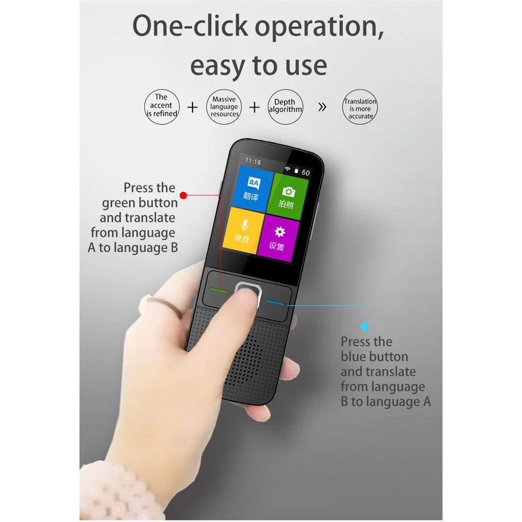 Language Translator Device Two Way:The multi-language portable translator supported 137 languages two way real-time translation.With this muti-language translator you can go everywhere you want,the language can't block you any more. Photographing Translation: It is not only a voice translator but also the word translator. The 5 million pixels and OCR(Character Recognition) camera of the T9 translator supports 44 languages for photo translation. The foreign words or sentence can be translated without any other input. The consumer can check what are the 44 countries in the description part. Instant translation and high accuracy: Supported by Microsoft and Google translation technique, the foreign language translator only takes seconds to translate the voice at an accuracy up 95%. 100 languages are available in this digital voice translator and people speaking multiple languages can talk together via our device. Smart Portable Translator:Product Dimension:13*5.5*1.38CM, Weight: 200g. Very compact and light. Foreign language translator only used in Wifi or hotspot internet,no need for SIM card, no need to download APP.Widely application in travelling,learning,shopping,business,making friends,comuncation and so on. Very easy to operate : The multi-language translator is very easy to operate,no need to install any app to your mobile,just connect this device with WIFI or 4G mobile wifi hotspot,then you can start the real time translation.Also it comes with only 3 buttons and 2.8 inch large HD touch screen which facilitate the operation of children and elders.This translator device’s voice is loud and clear ,The battery support standby time over 360 hours and continually working more than 10 hourspackages: