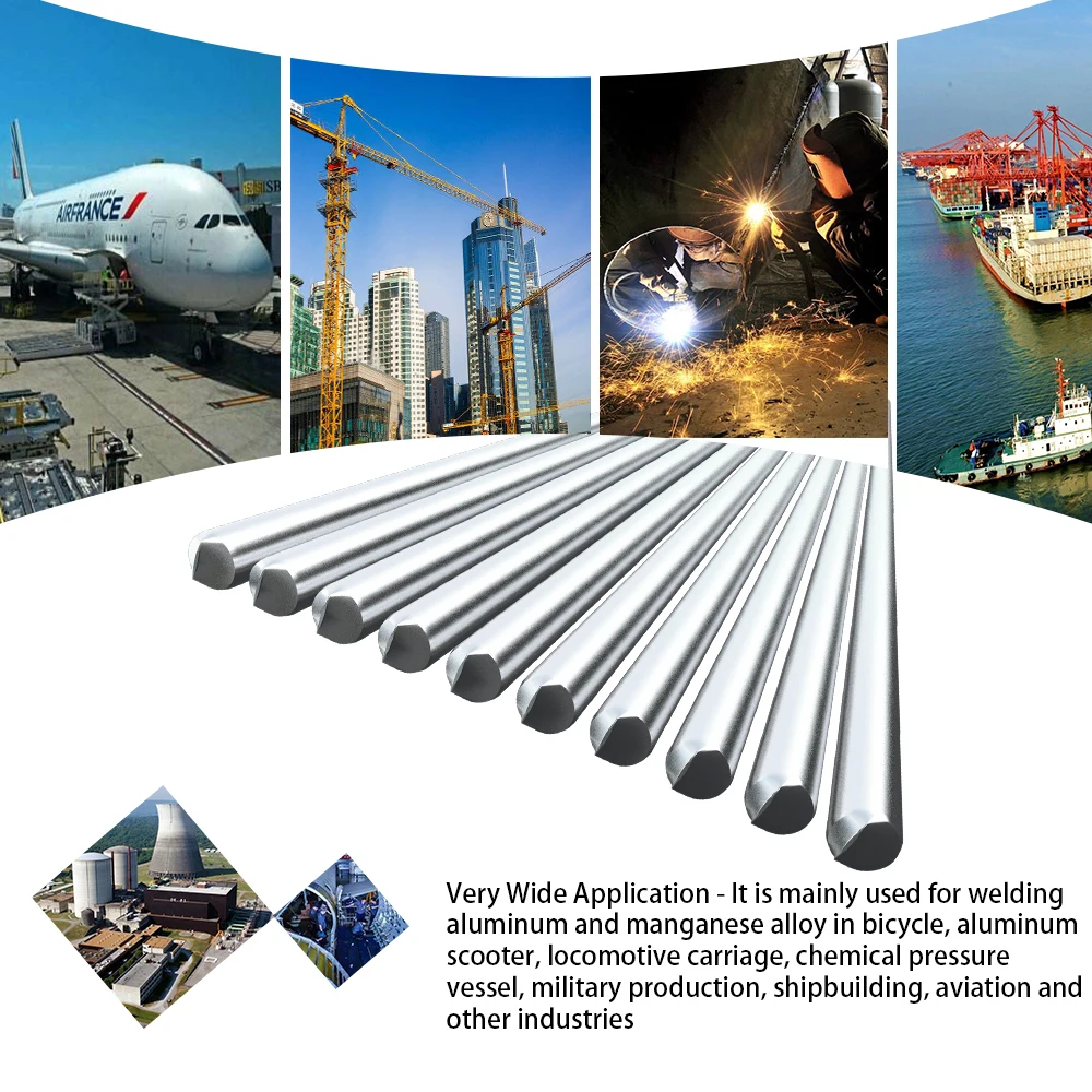 Can be used for a variety of heat sources, such as propane, oxy acetylene and so on. Low-temperature aluminum welding wire can weld almost all white metal, including aluminum, aluminum, cast aluminum, aluminum alloy and dissimilar welding between the above-mentioned metals, even for serious corrosion or oil pollution of white metal, and even that the aluminium alloy that cannot be repaired can be repaired. Applicable to the primary welding operator all-round welding, only a small heating device, after welding the weld strength is generally higher than the strength of the base metal itself, can understand the gas welding operation.