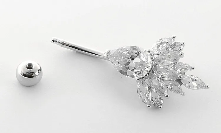 Штанга представляет собой стандартный 14 Калибр гипоаллергенный Серебряный аксессуар для пирсинга живота с белыми акриловыми шариковыми концами.
