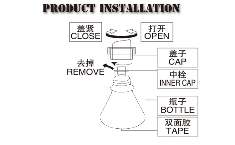 Способ установки:1. Откройте верхнюю крышку. (В первый раз, когда вы откроете верхнюю крышку, она будет крепче)2. Откройте верхнюю крышку.3. Снимите Среднюю крышку.4. Закройте верхнюю крышку.5. Снимите защитную бумагу с двусторонней ленты на нижней части бутылки и прикрепите ее в соответствующее положение на автомобиле. Меры предосторожности:1. Пожалуйста, избегайте попадания прямых солнечных лучей или высокихТемператураОкружающей среды.2. Хранить в недоступном для детей месте.3. Не пить, например, вход, пить более 2Стаканы чистой воды или молока и доставить его в госпитальДляЛечение.4. Если кожа контактирует или не контактирует с глазамиМожно использовать краску с большим количеством воды, если она находится в контакте.