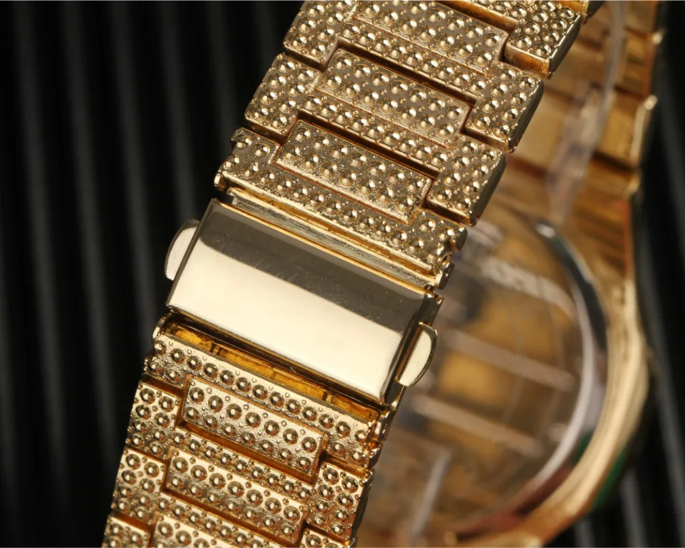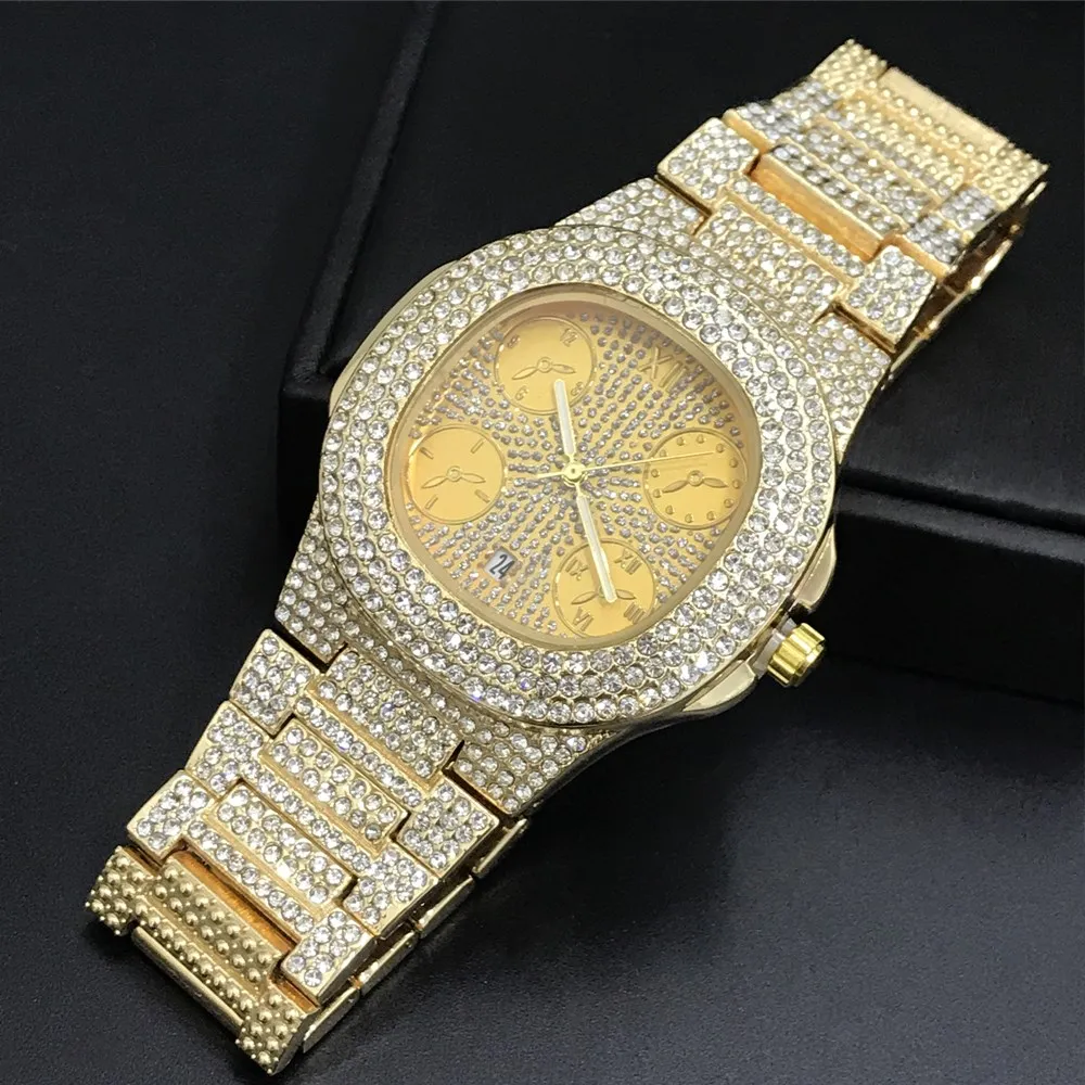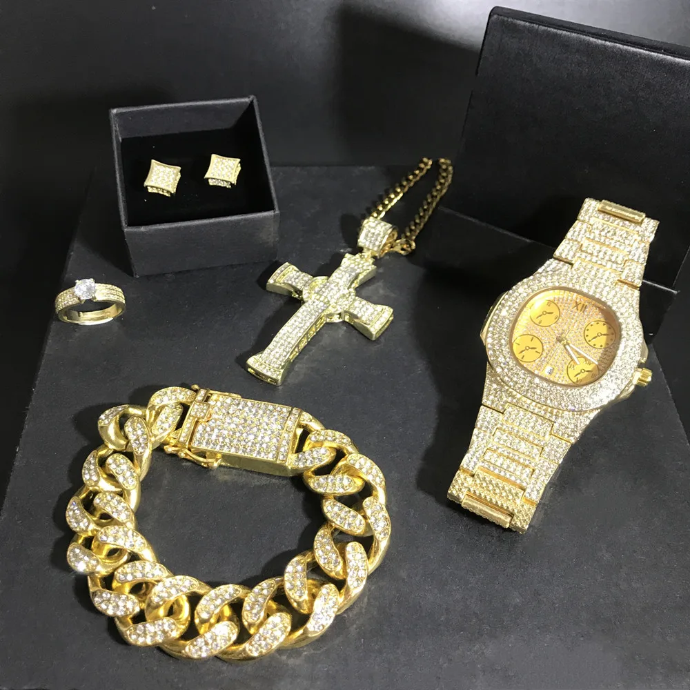 Часы: 100% новый Бриллианты лабораторные камни на браслете Задняя крышка корпуса из нержавеющей стали Позолоченный Часовой механизм: кварцевый (Япония) Батарея в комплекте. Чехол Размер: 43 мм (диаметр) Вес: 120 грамм Замок: с отворотом Пол: Для Мужчин Съемные звенья (регулируемые) Роскошный стильный чехол-накладка Упаковочный лист Часы-1 шт. 1 * ожерелье 1 * умный Браслет 1 * Кольцо 1 * серьги 1 * Подарочная коробка в комплекте Браслет: Браслет из нержавеющей стали в стиле хип-хоп знаменитостей 14K позолоченная нержавеющая сталь Высокое качество