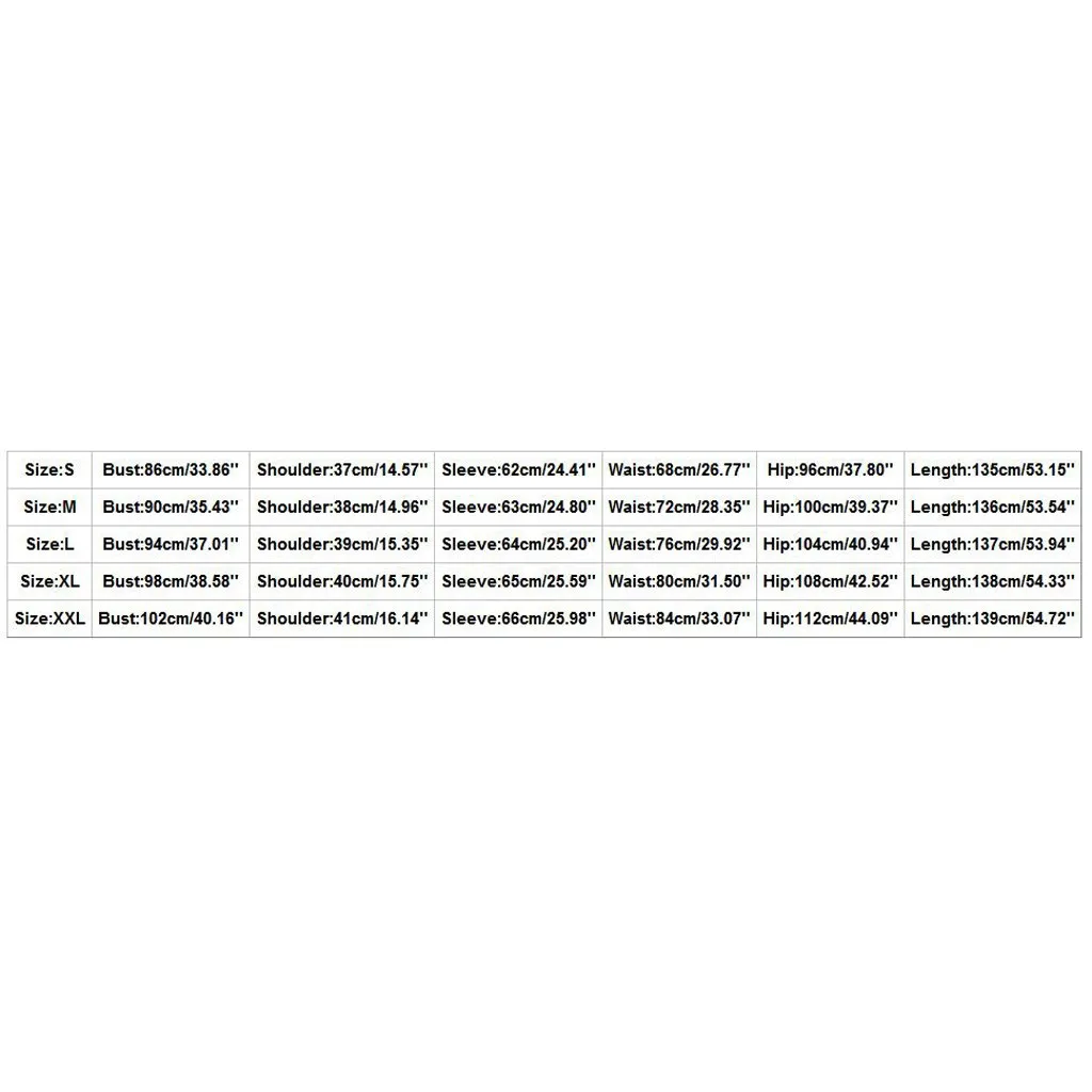 Size Bust Shoulder Sleeve Waist Hip Length S 86cm/33.86'' 37cm/14.57'' 62cm/24.41'' 68cm/26.77'' 96cm/37.80'' 135cm/53.15'' M 90cm/35.43'' 38cm/14.96'' 63cm/24.80'' 72cm/28.35'' 100cm/39.37'' 136cm/53.54'' L 94cm/37.01'' 39cm/15.35'' 64cm/25.20'' 76cm/29.92'' 104cm/40.94'' 137cm/53.94'' XL 98cm/38.58'' 40cm/15.75'' 65cm/25.59'' 80cm/31.50'' 108cm/42.52'' 138cm/54.33'' XXL 102cm/40.16'' 41cm/16.14'' 66cm/25.98'' 84cm/33.07'' 112cm/44.09'' 139cm/54.72''