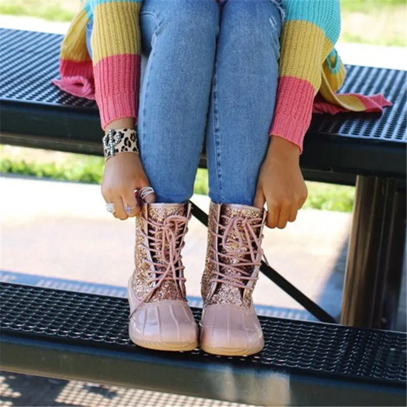 Женские резиновые сапоги; Шикарные ботильоны на утином пуху; Водонепроницаемые Нескользящие Модные женские уличные ботинки на плоской платформе со шнуровкой размера плюс 35-43