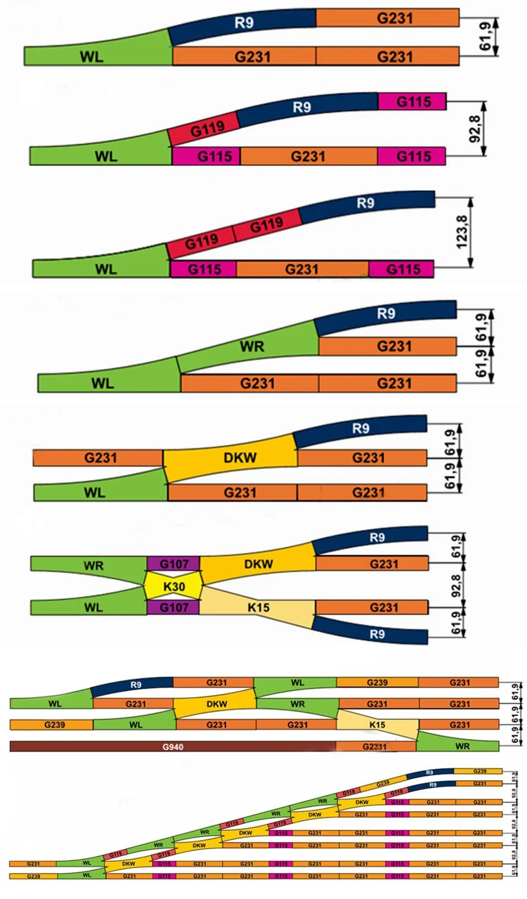 R2 изогнутая рейка (30 °) Описание изделия: изогнутый рельс, № 55212, диаметр 84,4 см, дуга 30 °, 12 секций необходимы для формирования круга. Размер: Масштаб 1:87. Ширина колеи: 1,65 см, высота: 0,25 см. R2 субсорт 55462 / 41 одиночный субсорт не содержит дорожки, которые могут быть объединены с одной дорожкой плюс винты (один набор из трех)