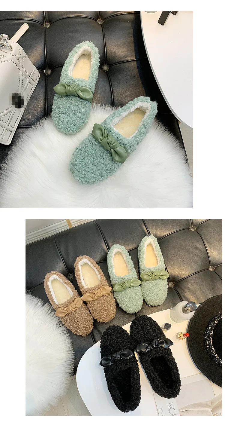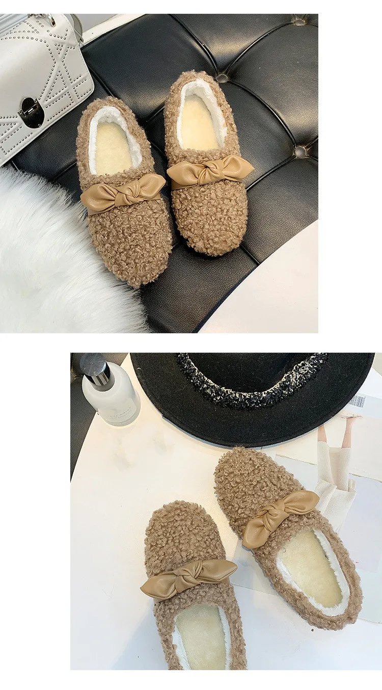 Зимняя женская обувь; лоферы на плоской подошве; женская повседневная обувь на меху без застежки; Модные женские короткие плюшевые теплые зимние ботинки; обувь на платформе с бантом