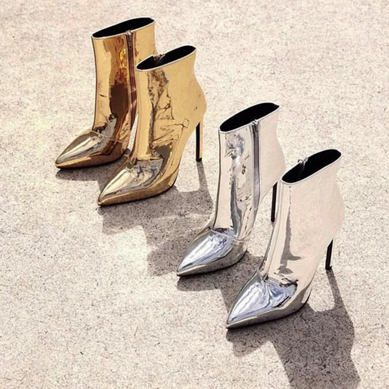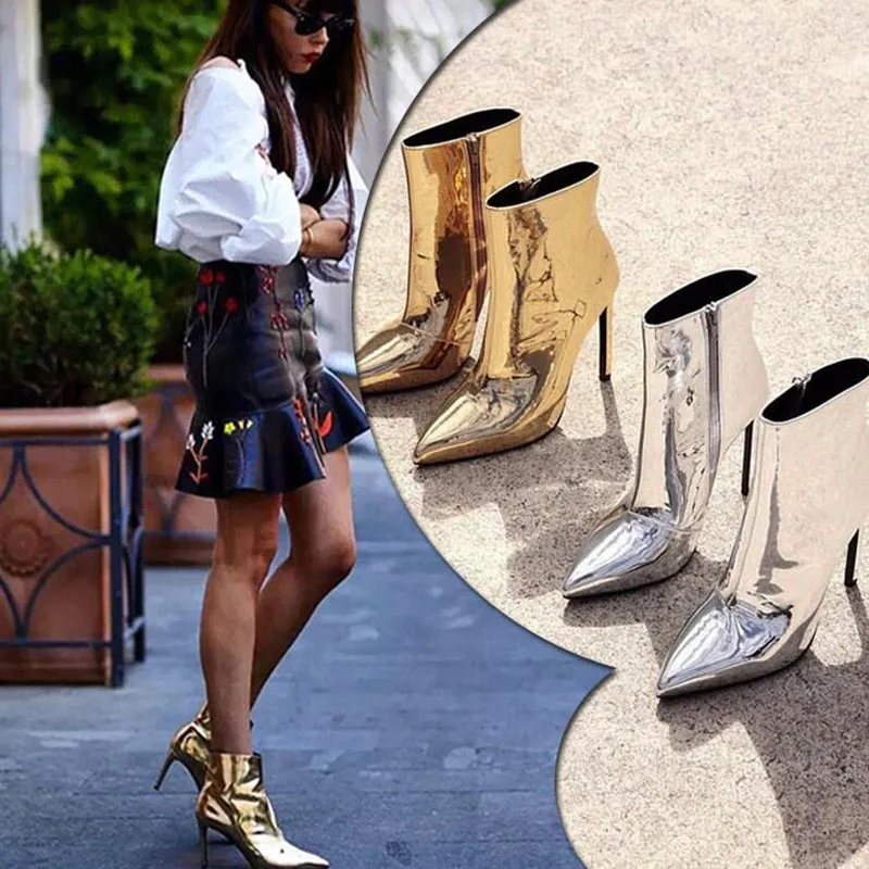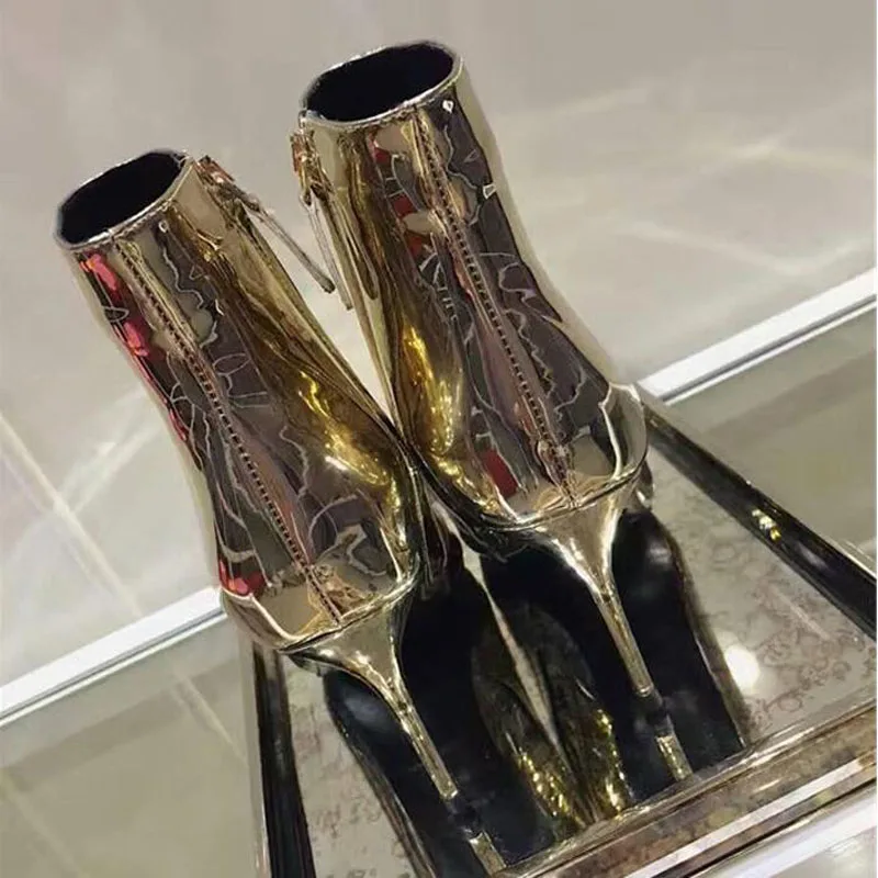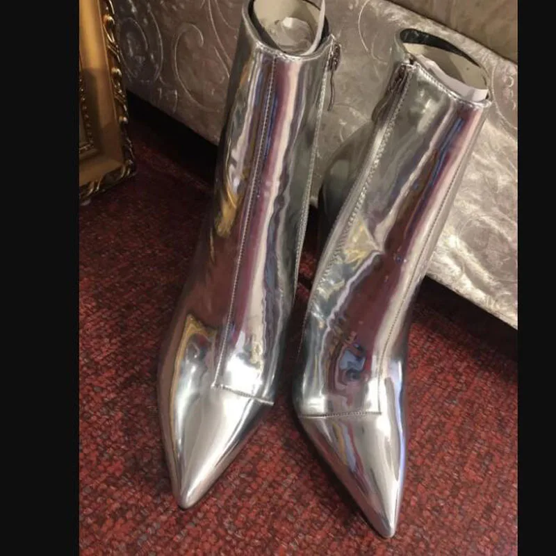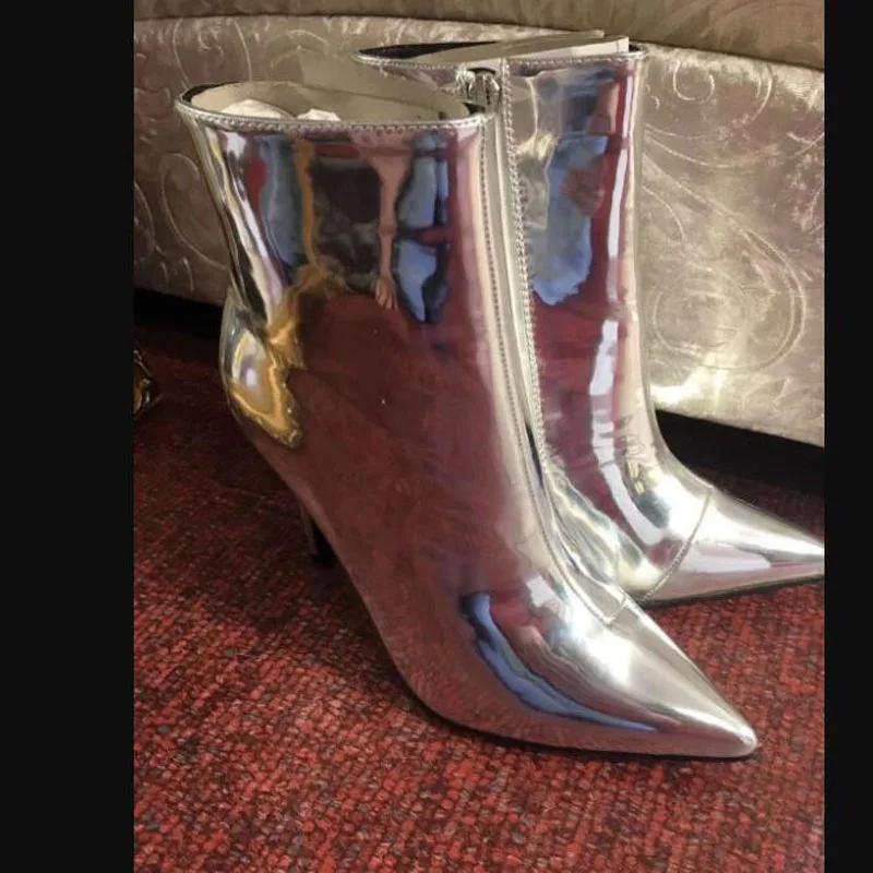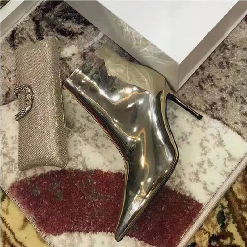 Модные женские ботинки, размеры 34-41 осенне-зимняя женская обувь на высоком каблуке, обувь золотистого и серебристого цвета женские Теплые ботильоны из лакированной кожи на меху