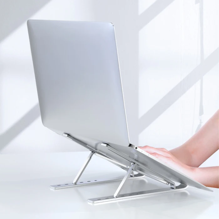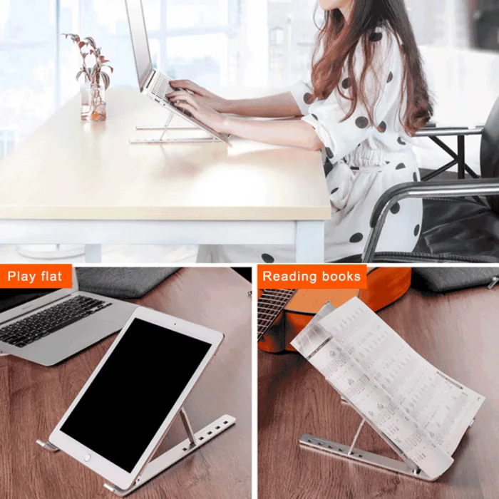 1. Ультра-тонкая Складная подставка для ноутбука, эргономичный угол высоты защищает пользователя шейного отдела позвоночника и здоровья глаз.