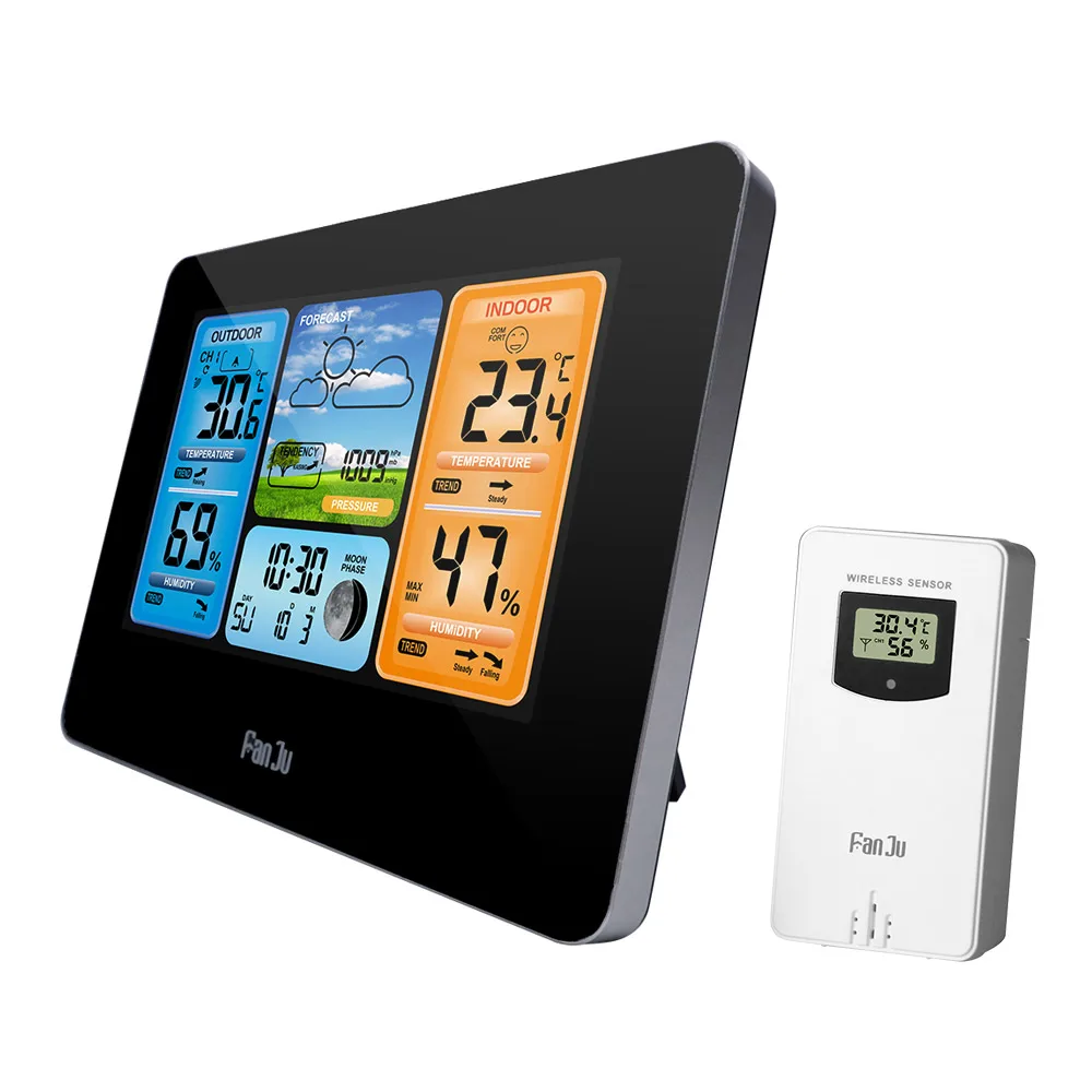 FanJu FJ3373 многофункциональная цифровая метеостанция с будильником. Имеет функции термометра, гигрометра и барометра, настроить беспроводной датчик. Эти данные могут быть использованы для прогнозирования погодных условий в будущем. Он не только дает вам знать время и календарь, но и помогает вам в вашей жизни. Подходит для различных мест, будь то на столе или на стене. Простой и современный дизайн-отличный инструмент и Декор для дома.
