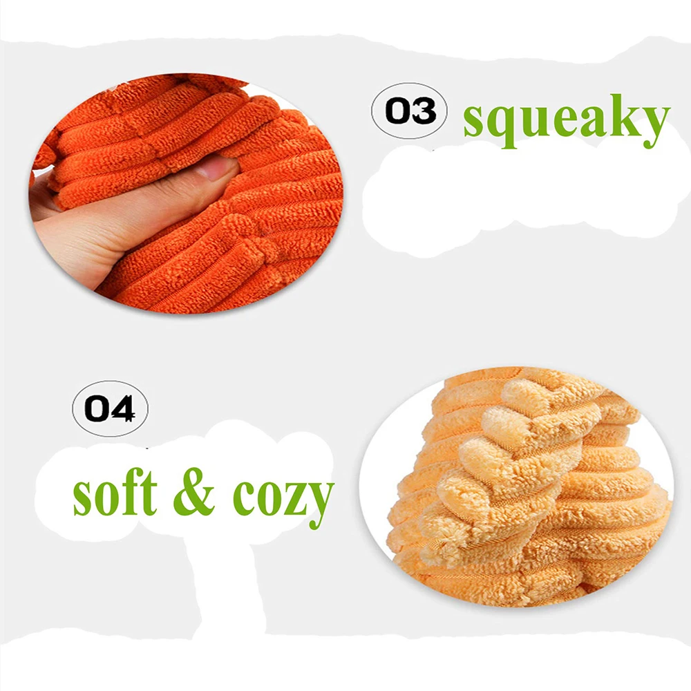 -Вся пищащая плюшевая игрушка для собак имеет пищалку внутри, легко сжимается, чтобы сделать четкий звук, обеспечить вашей собаке длительное развлечение, помогает им борется со скукой и сокращает озорное отношение, когда они играют самостоятельно в домашних условиях.