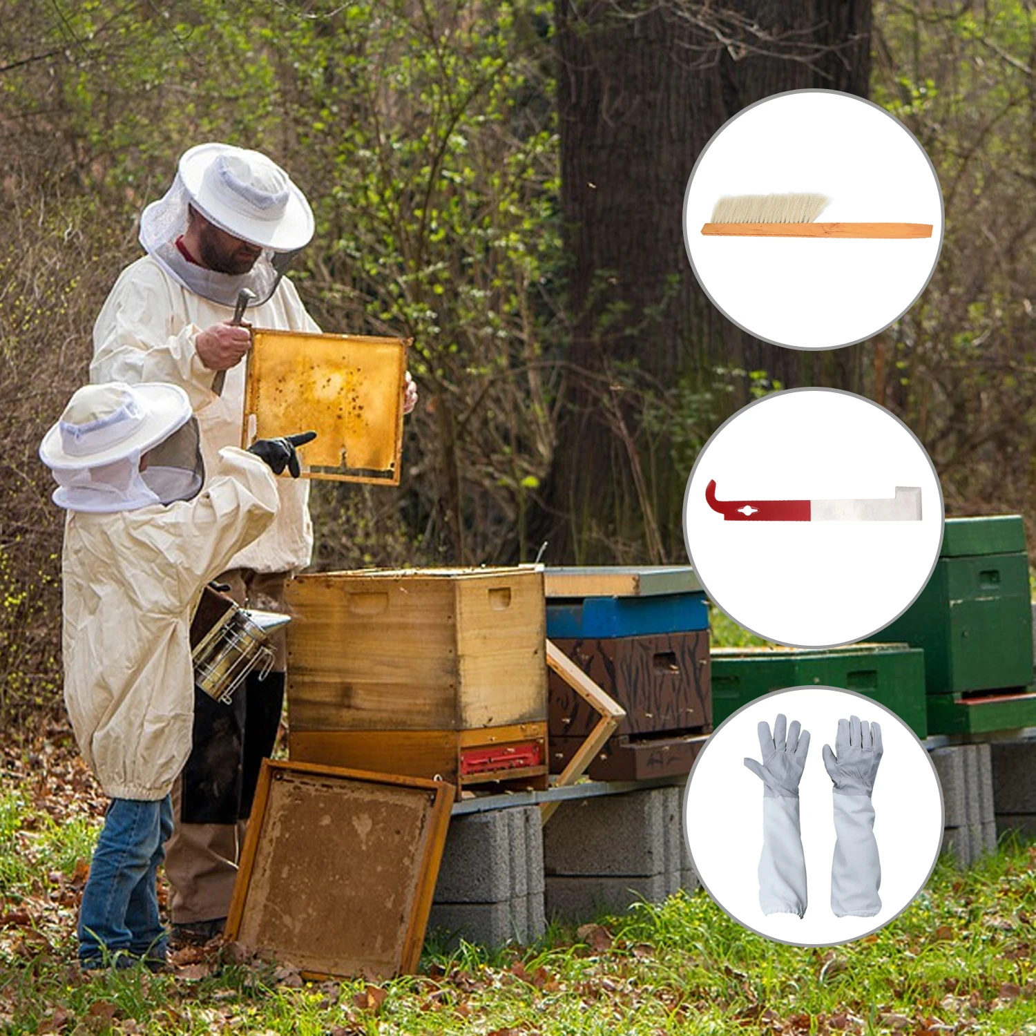 [Легко использовать]Идеальный медовый комплект для сбора для новых пчеловодов! Этот набор из 4 инструментов поставляется с пчелиная курточка, инструмент для улей J hook, щеткой для пчеловодства и перчатками для пчеловодства.
