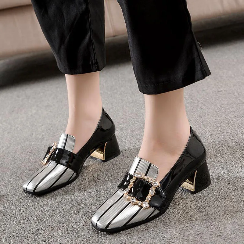Большой размер 40; Женские туфли-лодочки; Стразы; Водонепроницаемые Мокасины с пряжкой; Туфли под платье из лакированной кожи квадратный носок; Женская офисная обувь; Обувь для женщин; zapatos mujer