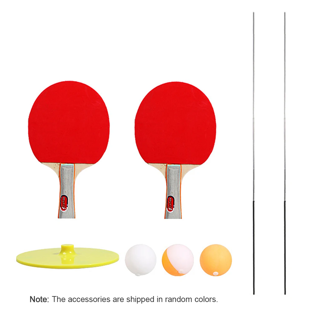 Тренировочный Набор для настольного тенниса включает в себя 2 ракетки для настольного тенниса, 3 мяча, 1 основание и 2 гибких опорных стержня.