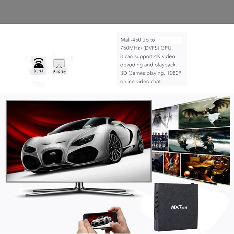 OS Android 7.1 Video MKV,WMV/VC-1 SP/MP/AP,MPG,MPEG,dat,avi,mov,iso,mp4,rm,H.264,H.265,realVideo 8/9/10, VP8/9,up to 2160P Audio MP3,AAC,WMA,RM,FLAC,OGG Picture jpg,JPEG,MJPEG,PNG Adobe Flash Adobe Flash 10.1 support or above Support language Chinese , English ,Germany ,Japanese, Korea etc. 84 languages DLNA Pushed the video, audio, pictures from phone or network to TV GoogleTV Remote Through wi-fi network to realize control the product LAN Through the LAN, can check other devices to share information 3D moive Support 3D movie Motivator air-mouse Support the body feeling game, such as playing tennis, paper planes, shooting, etc