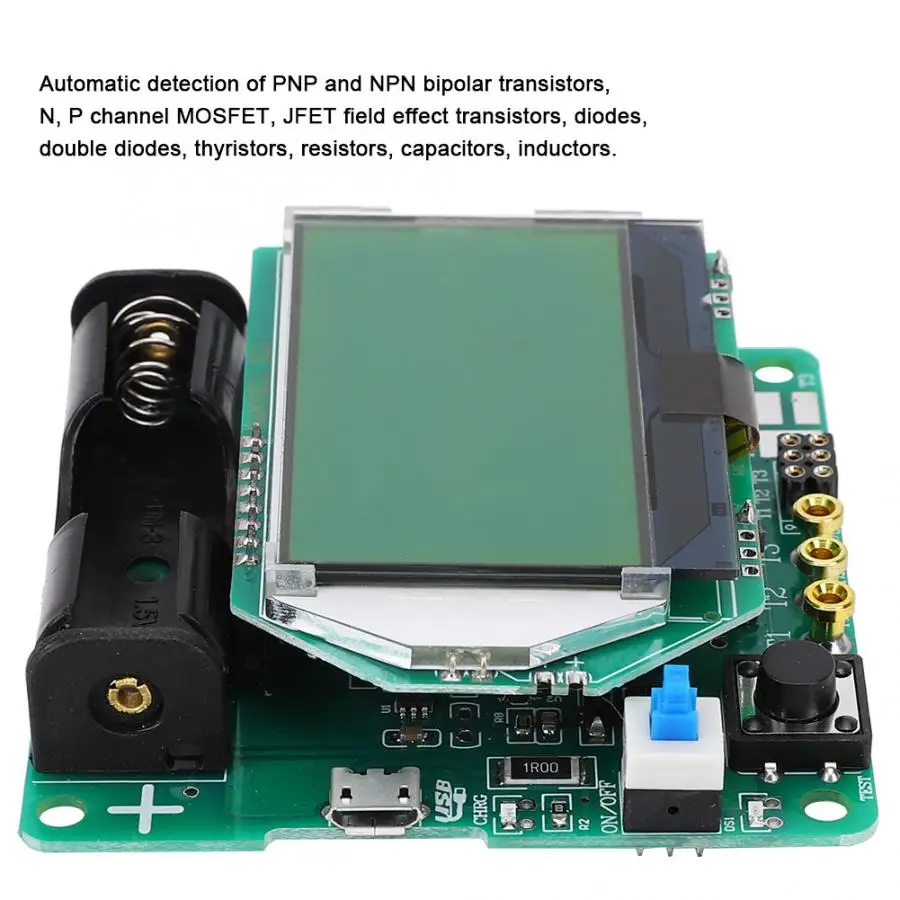 1. Automatic detection of PNP and NPN bipolar transistors, N, P channel MOSFET, JFET field effect transistors, diodes, double diodes, thyristors, resistors, capacitors, inductors.