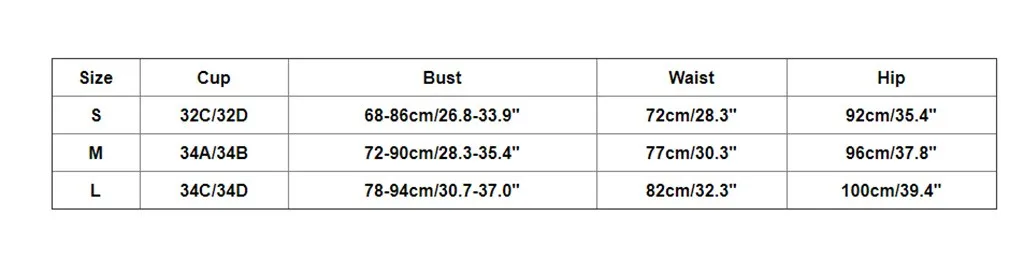 Size Cup Bust Waist Hip S 32C/32D 68-86cm/26.8-33.9'' 72cm/28.3'' 92cm/35.4'' M 34A/34B 72-90cm/28.3-35.4'' 77cm/30.3'' 96cm/37.8'' L 34C/34D 78-94cm/30.7-37.0'' 82cm/32.3'' 100cm/39.4''