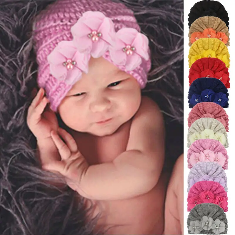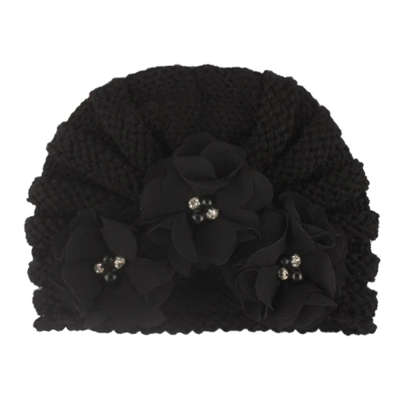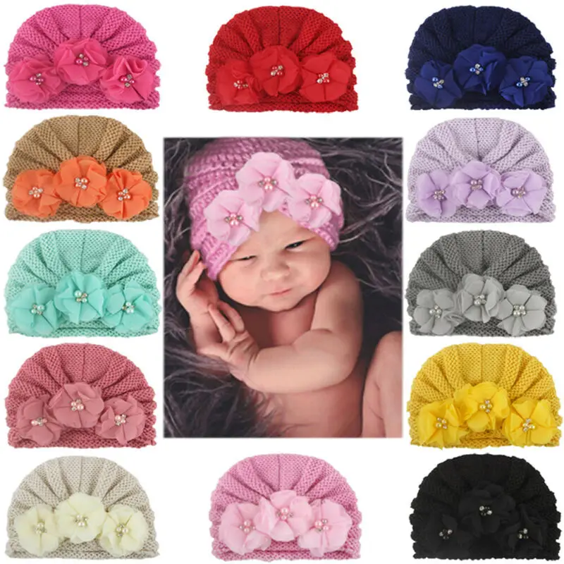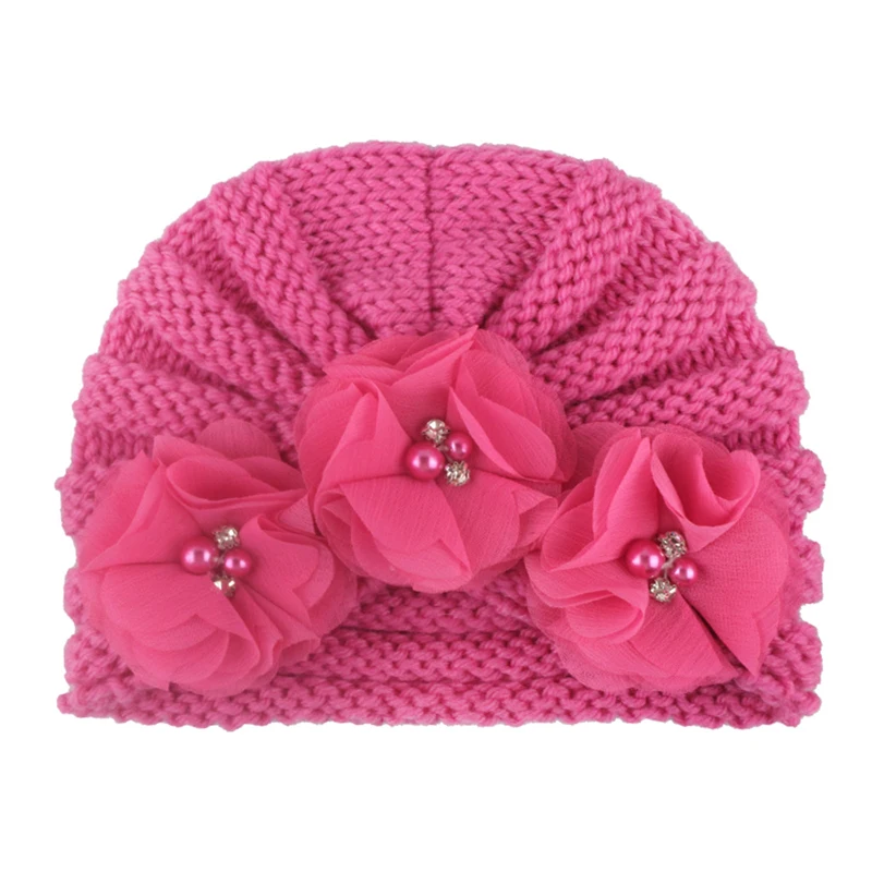 Вязаная шапка для новорожденных с тремя цветами, жемчугом и стразами, шапка-тюрбан, теплая шапка