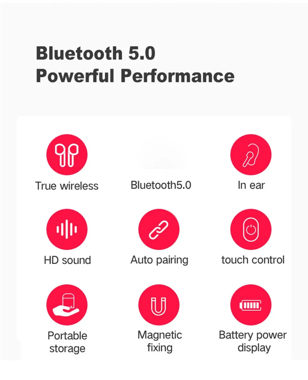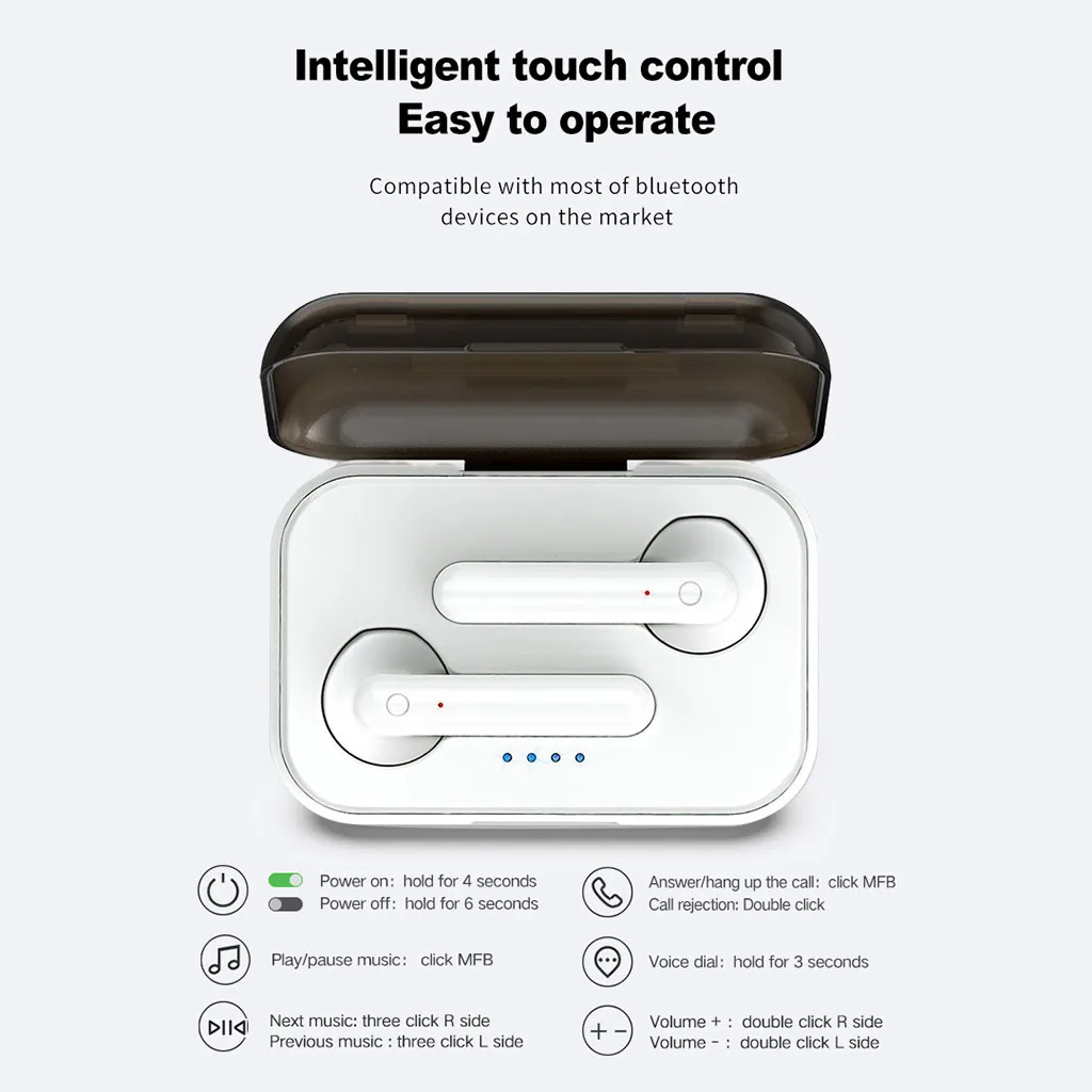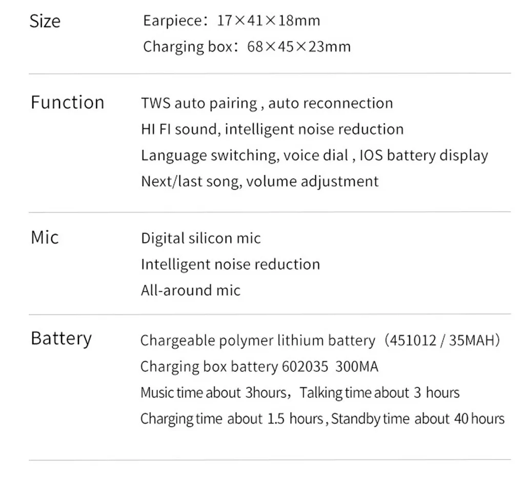 1. HiFi Качество звука: Очистите качество звука, сделайте звук более деликатным. 2. Модернизированный bluetooth 5,0 Версия: более стабильная передача звука. 3. Подобрать и подобрать: Автоматическое включение коробки, Автоматическое Сопряжение по bluetooth. 4. Бинауральный вызов и Технология снижения уровня шума и HiFi Качество: повышение уровня распознавания Голоса и может легко общаться даже в шумной среде. Сделать Вызов более четким и реальным. 5. Мини скрытый наушник, Легкий, эргономичный дизайн обеспечивает комфорт и комфорт Удобство при ношении.Параметры: