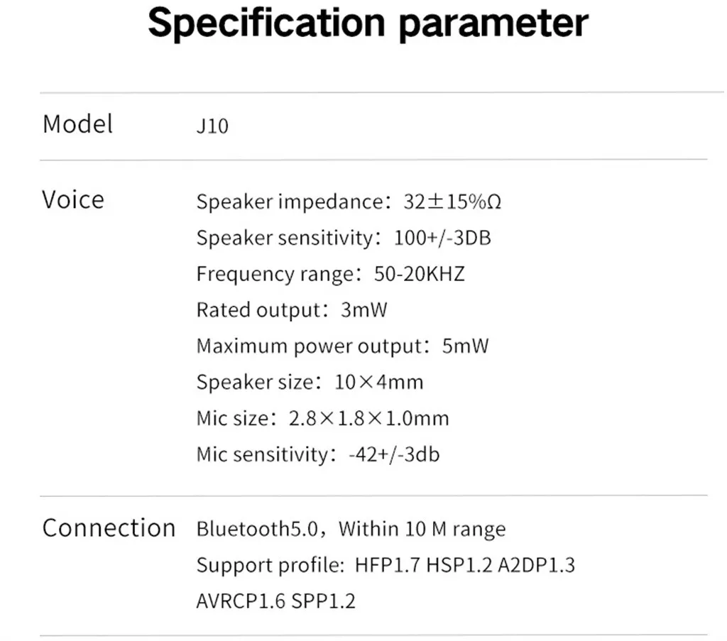 Модель: J10 Цвет: белый Версия Bluetooth: V5.0 Рабочий диапазон Bluetooth : 10 м Батарея Спецификация: 35 мАч X 2 Зарядное устройство: 300 мАч Время разговора: 3 ч Время воспроизведения музыки: около 3 ч Время зарядки: около 1,5 H Переключатель muisc: Да Профиль: HFP,HSP,A2DP,AVRCP Диапазон частот: 2,4 ГГц Дисплей питания IOS: Да Снижение уровня шума: CVC 6,0 Декодирование аудио: SBC, инструкция по эксплуатацииПосылка включает в себя: