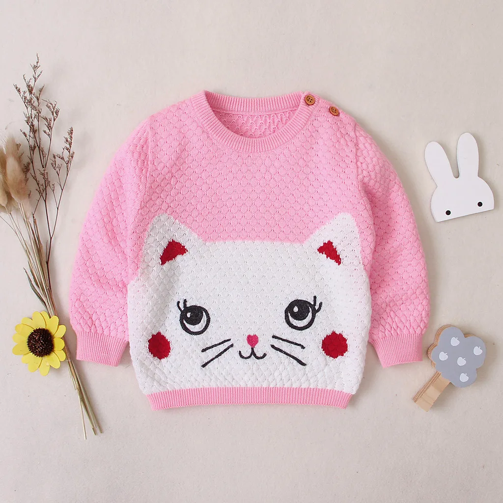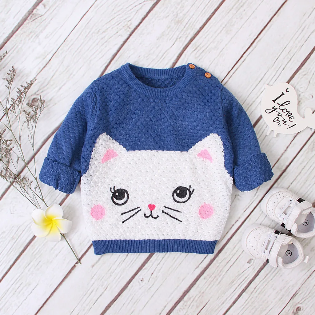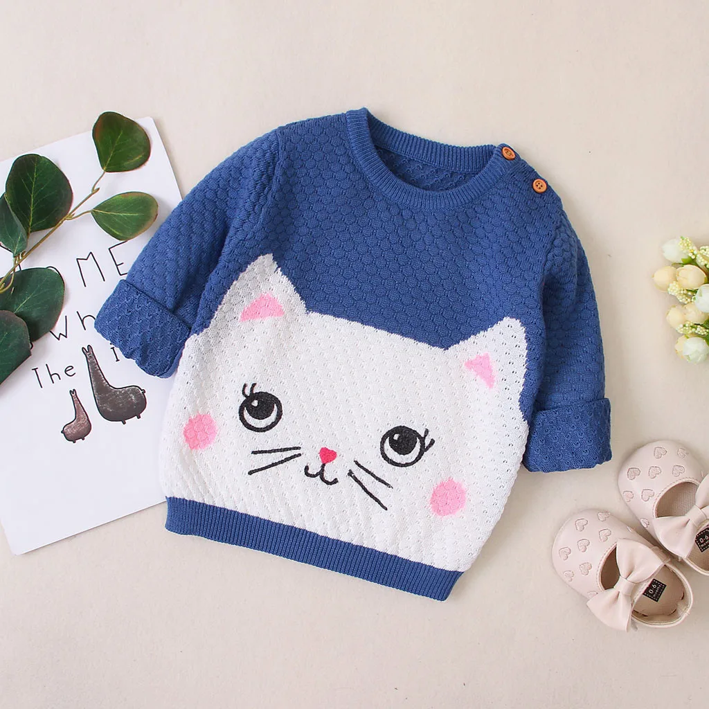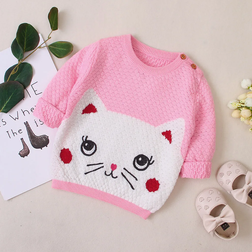 Зимние вязаные топы для маленьких девочек, теплый вязаный свитер с капюшоном и рисунком кота