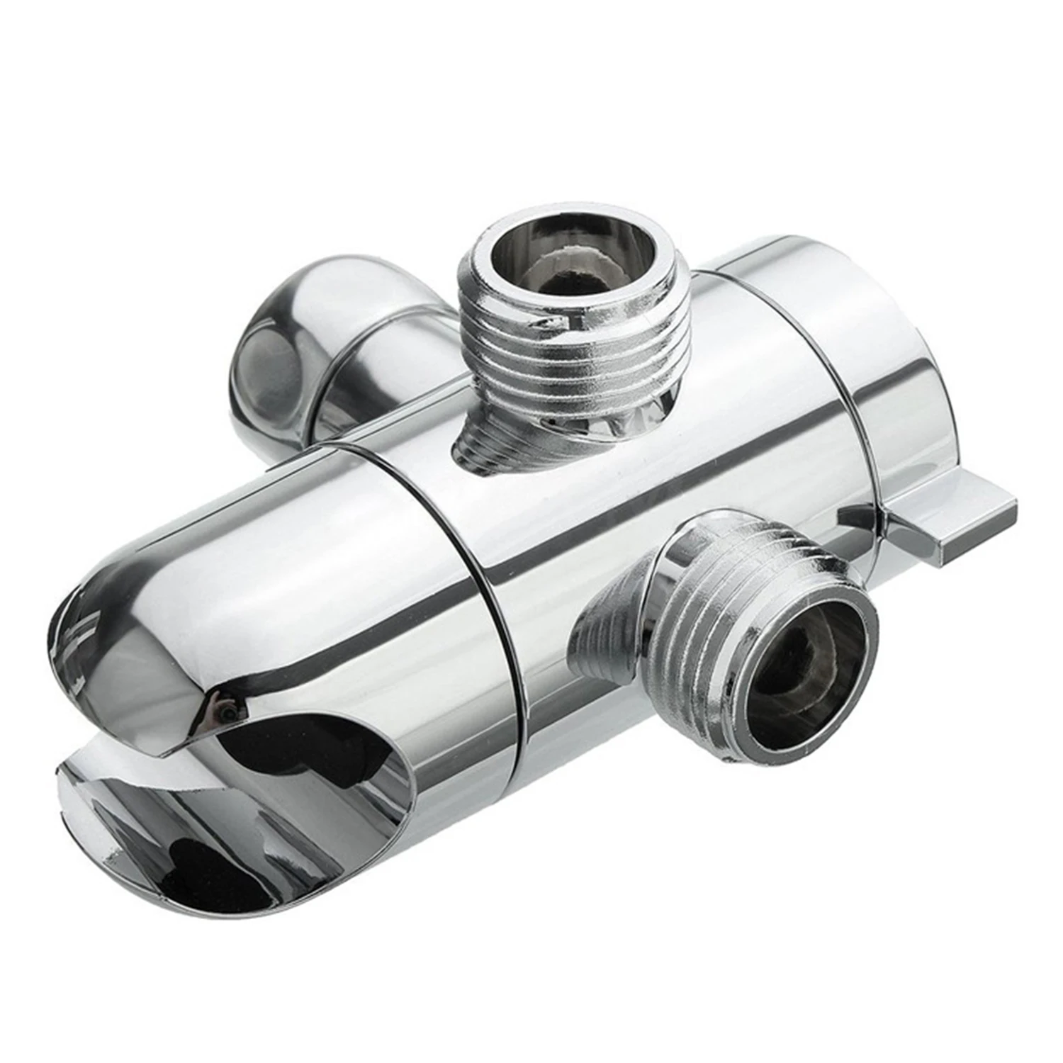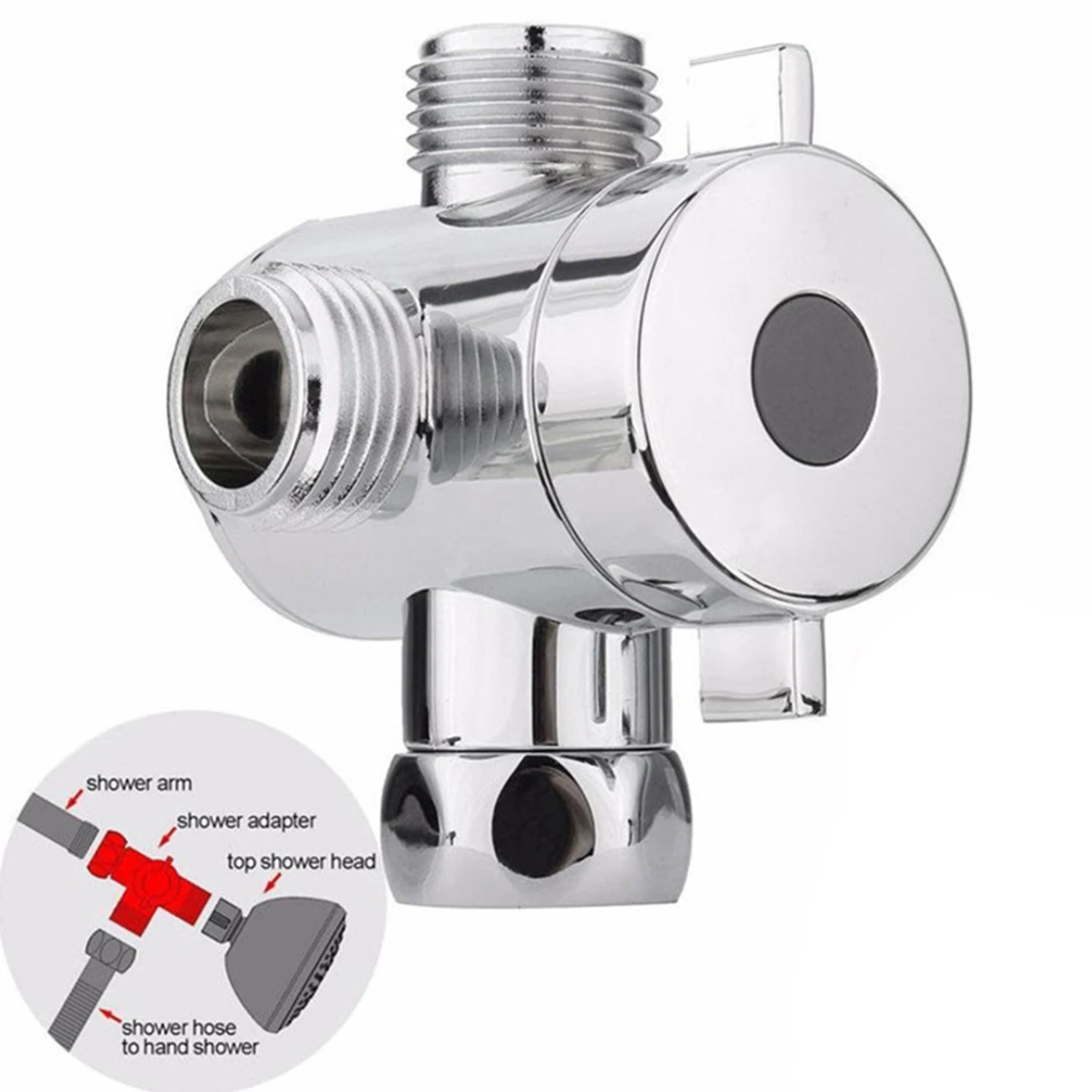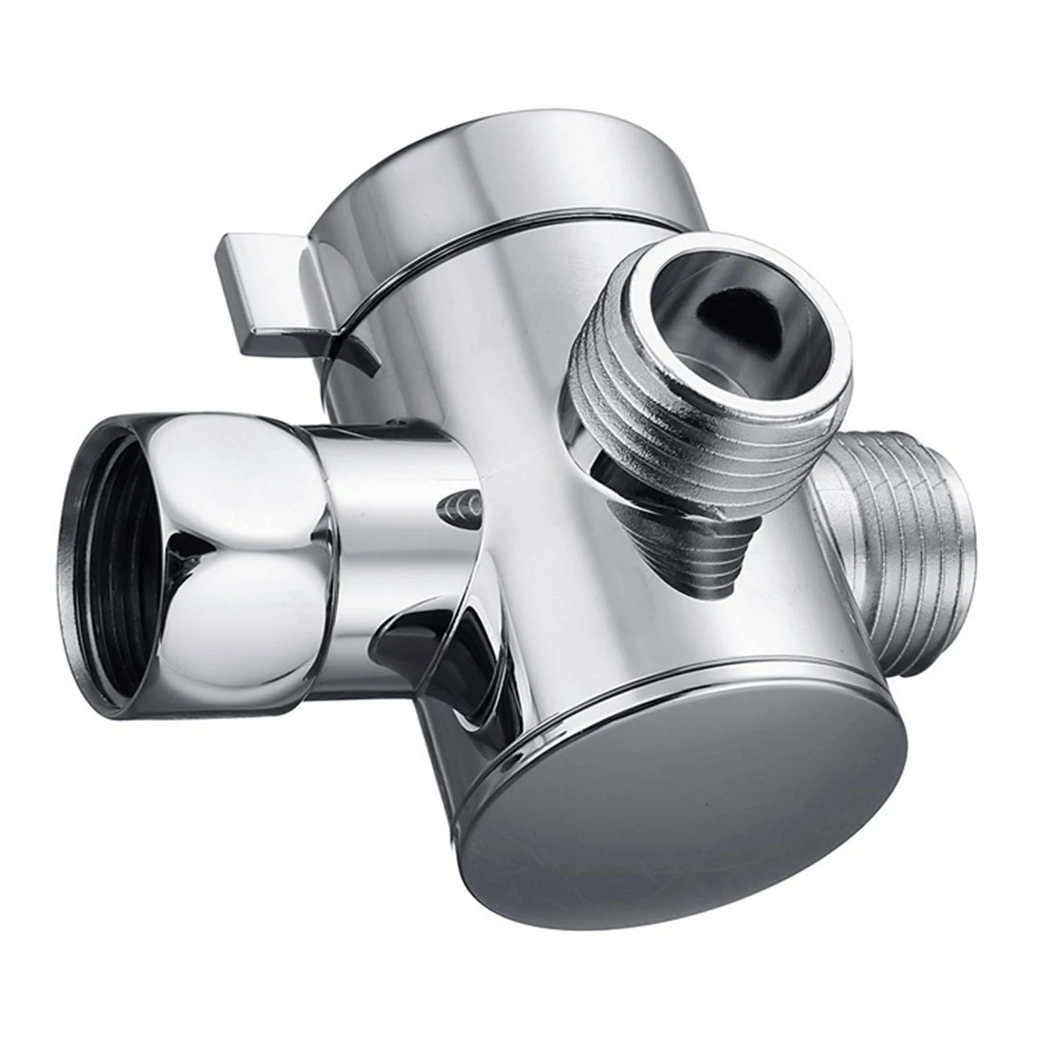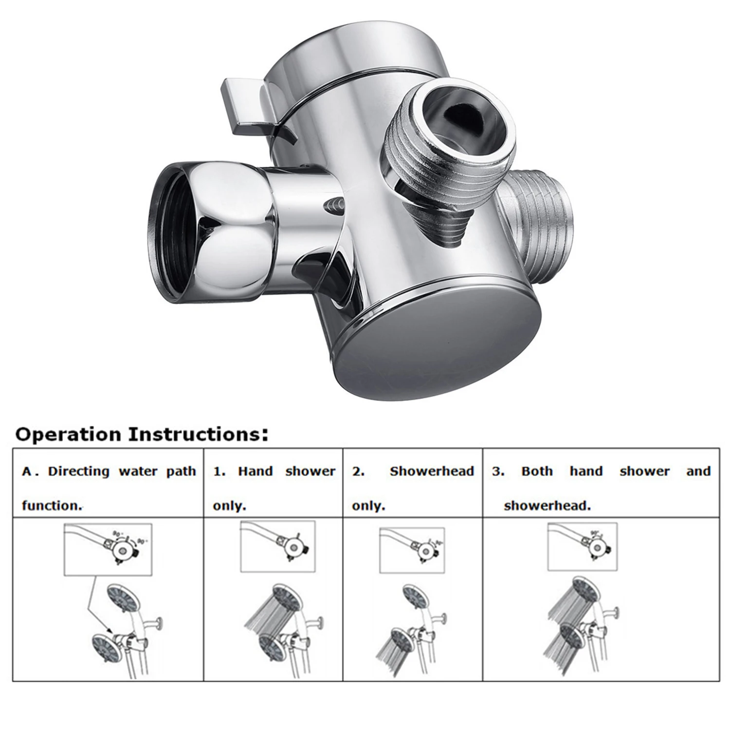 3-полосная душ переключающий клапан изготовлен из АБС-пластика с блестящий хромированный поверхности, коррозионно-стойкие и герметичность. Переключение потока воды между ручным душем и фиксированной душевой головкой. Подходит для садовых шлангов, опрыскивателей, стандартных шлангов с помощью переключателя смесителя и т. д.