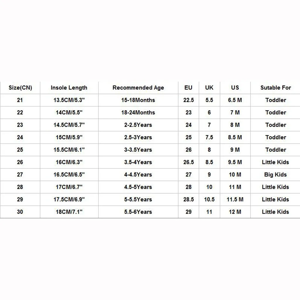 Size(CN)Insole LengthRecommended AgeEUUKUSSutable For2113.5CM/5.3"15-18Months22.55.56.5 MToddler2214CM/5.5"18-24Months2367 MToddler2314.5CM/5.7"2-2.5Years2478 MToddler2415CM/5.9"2.5-3Years257.58.5 MToddler2515.5CM/6.1"3-3.5Years2689 MToddler2616CM/6.3"3.5-4Years26.58.59.5 MLittle Kids2716.5CM/6.5"4-4.5Years27910 MBig Kids2817CM/6.7"4.5-5Years281011 MLittle Kids2917.5CM/6.9"5-5.5Years28.510.511.5 MLittle Kids3018CM/7.1"5.5-6Years291112 MLittle Kids
