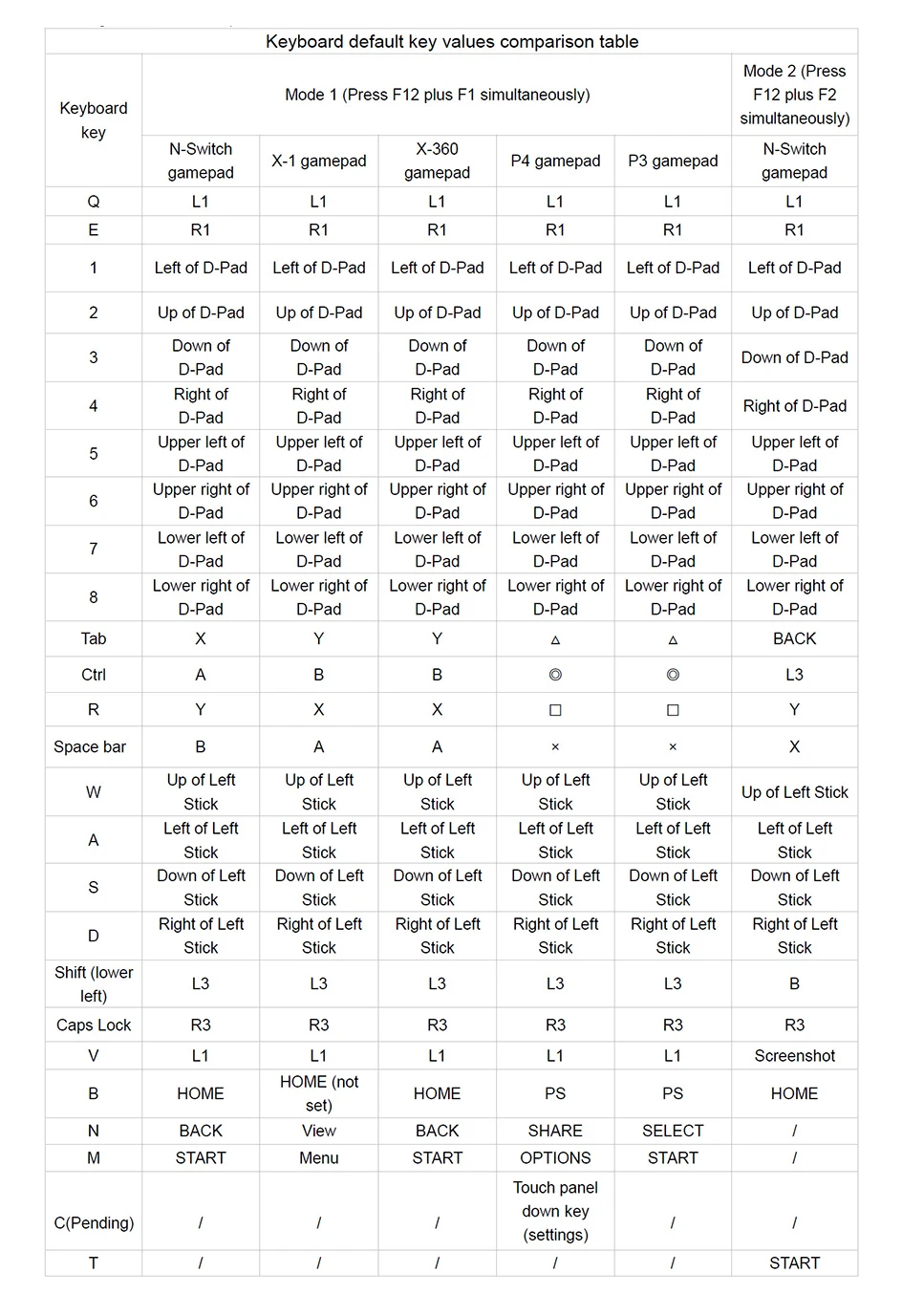 По умолчанию основные ценности сравнительная таблица для клавиатуры клавиш и клавиши геймпада/палочки