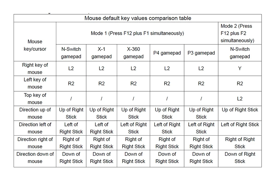 По умолчанию основные ценности сравнительная таблица для Клавиши Мыши/курсора и клавиши геймпада/палочки