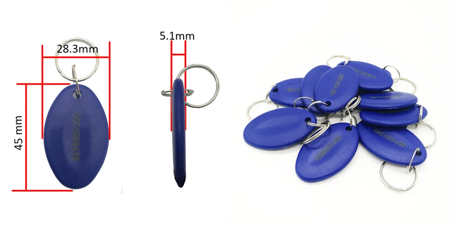 Только можно прочитать, пожалуйста, обратите внимание. Расстояние чтения: 3-5 см; Материал: АБС-пластик Частота отклика: RFID 125 кГц, Тип чипа: TK4100 Рабочая температура: от-40 °C до 85 °C Водонепроницаемый Размер: 45*28,3*5,1 мм Каждый брелок имеет идентификационный номер uniqe (стандарт имеет передние 10 цифр No. print).