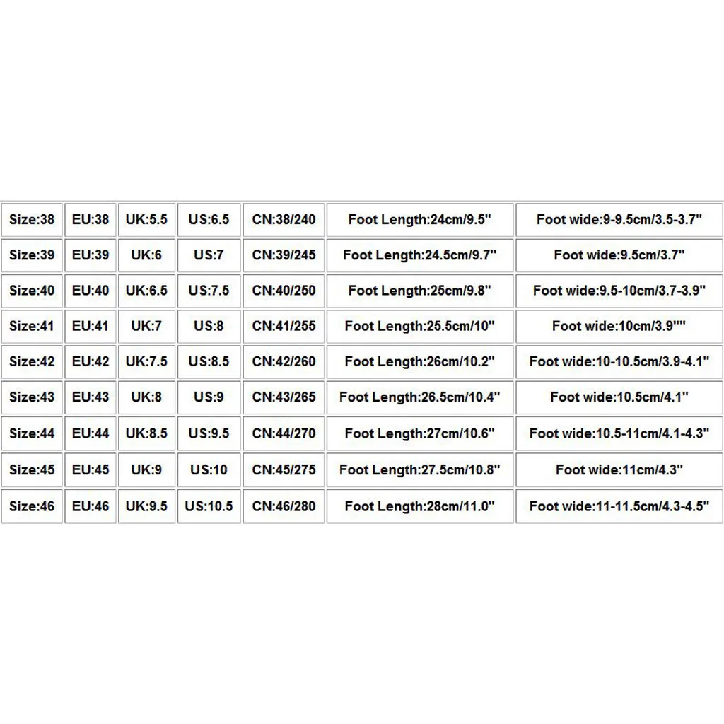 Размер ЕС Великобритания Свяжитесь с нами CN Foot Длина При покупке обувь на широкую ногу 38 38 5,5 6,5 38/240 24 см/9,5" 9-9,5 см/3,5-3,7" 39 39 6 7 39/245 24,5 см/9,7" 9,5 см/3,7" 40 40 6,5 7,5 40/250 25 см/9,8" 9,5-; высотка каблука 10 см/3,7-3,9" 41 41 7 8 41/255 25,5 см/10" Высота каблука 10 см/3,9 "" 42 42 7,5 8,5 42/260 26 см/10,2" 10-10,5 см/3,9-4,1" 43 43 8 9 43/265 26,5 см/10,4" 10,5 см/4,1" 44 44 8,5 9,5 44/270 27 см/10,6" 10,5-11 см/4,1-4,3" 45 45 9 10 45/275 27,5 см/10,8" 11 см/4,3" 46 46 9,5 10,5 46/280 28 см/11,0" 11-11,5 см/4,3-4,5"