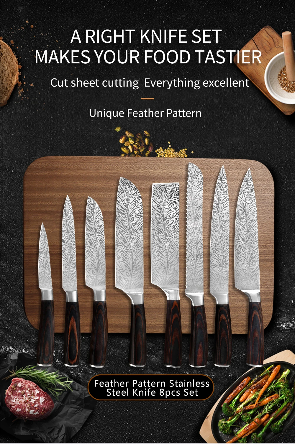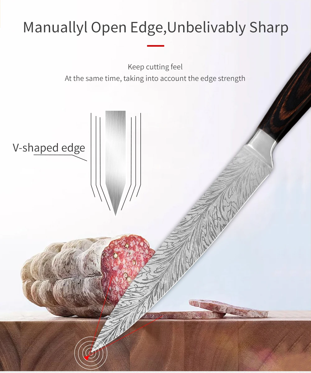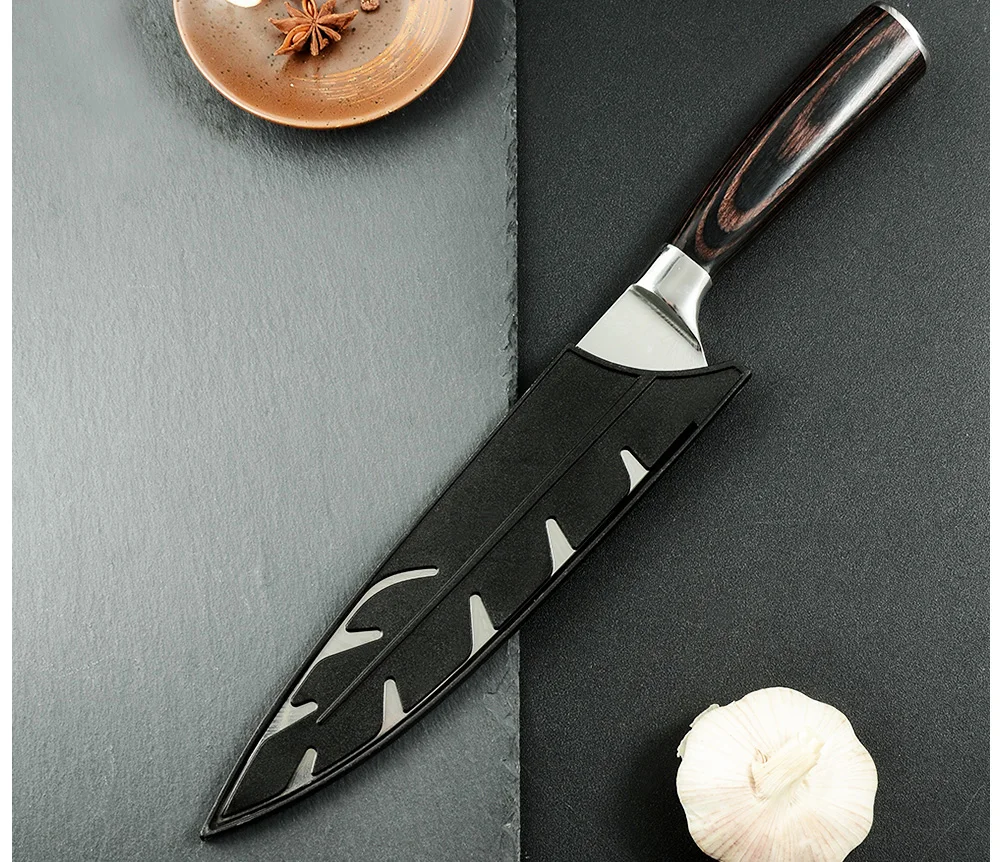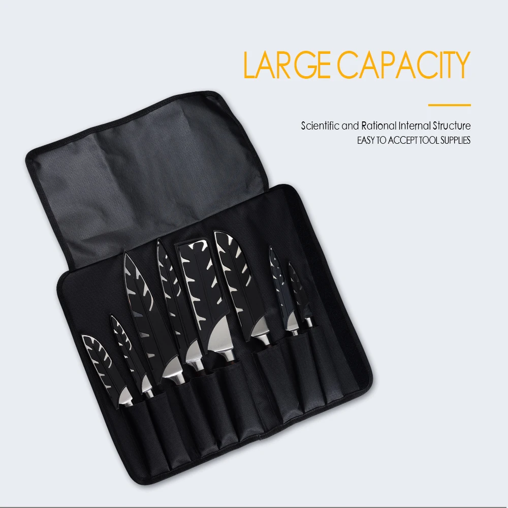 Этот кухонный нож, прочный и практичный, изготовлен из лезвия из нержавеющей стали 7Cr17 и цветной деревянной ручки. 8-карманный нож для повседневного использования, сумка изготовлена из Оксфордской ткани, которая отличается прочностью и водонепроницаемый. С удобной ручкой, вы можете легко носить с собой в любом месте. Это хороший партнер набора ножей.