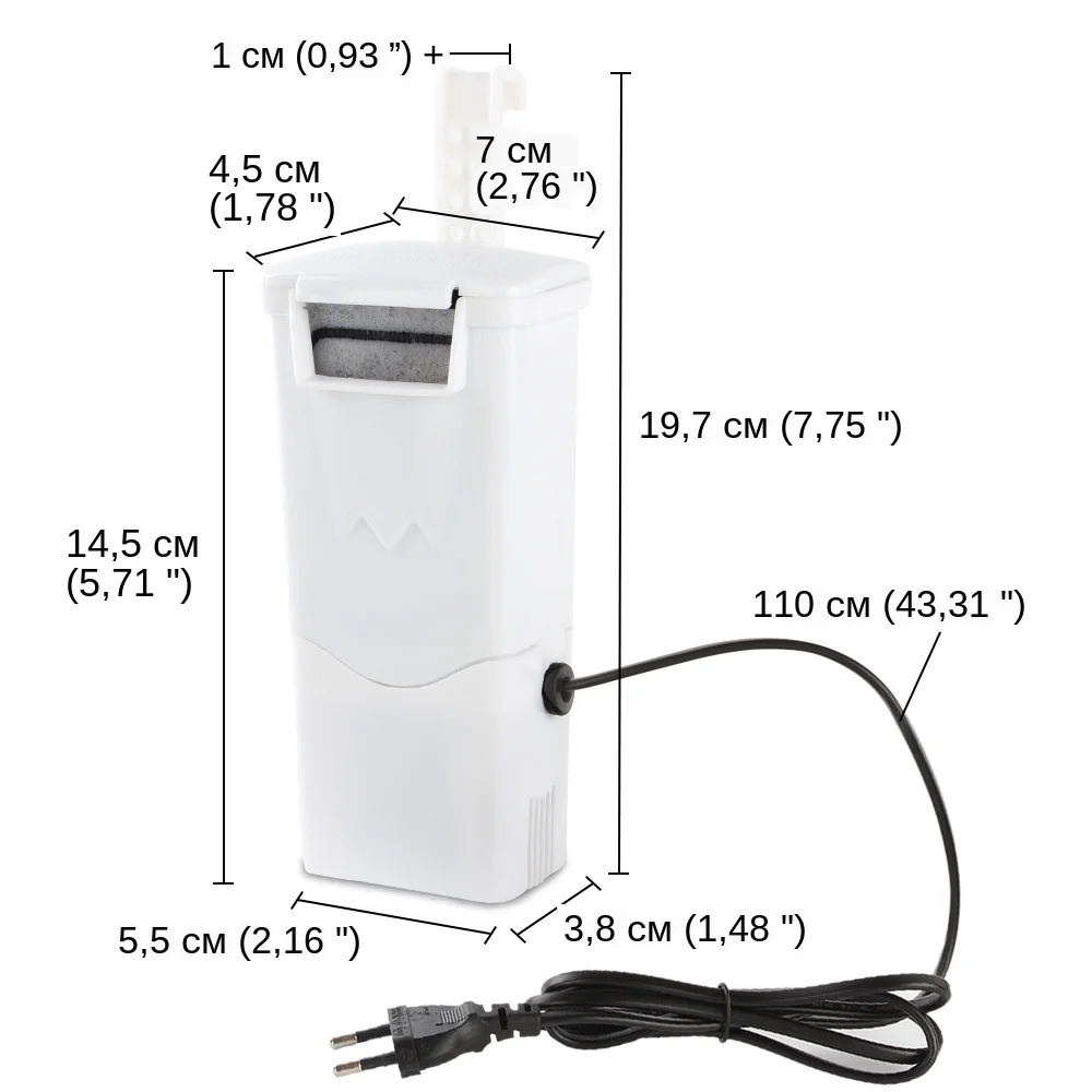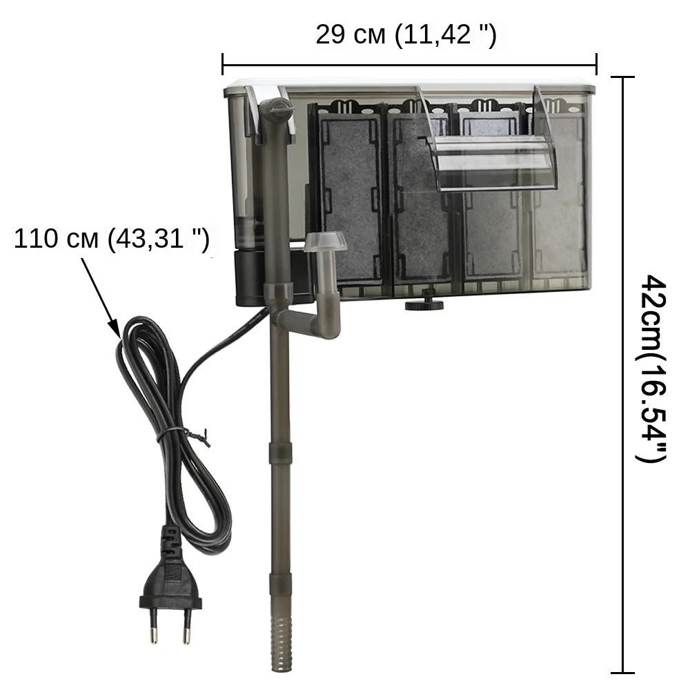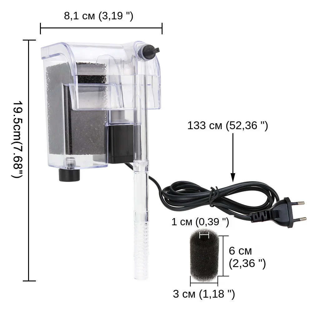 Детали: -Цвет: белый -Материал: АБС-пластик -Мощность: 3 Вт -Макс. Расход: 240 л/ч -Напряжение: 220 В 110 В --- 50 Гц -Длина шнура питания: 220 В-1,1 м/43,3” 110 В-1,2 м/44,1” Особенности: -Этот фильтр в баке стиль дизайн и просто нужен низкий уровень воды. -Многофункциональность: откачка и фильтрация, циркуляция воды и удаление примесей из воды и т. Д. -Двойная фильтрация: усиленный активированный уголь и фильтрующая пластина, Быстрая фильтрация, улучшение качества воды. -Большое внутреннее пространство: для размещения большего количества фильтров по мере необходимости. -Энергосбережение: 3 Вт Фильтр низкой мощности, низкое потребление. -Циркуляция водопада, четкая и видимая. -Ультра-тихий дизайн: Используйте мотор шумоподавления, тихая работа. -Два способа крепления: фиксация присосок или фиксация крючка, переключение по желанию. -Регулируемый крючок: регулируемый диапазон от 1 до 7 см (0,39 ”-2,75”). Подходит для стены аквариума 8 мм. -Поставляется с фильтром: 4 * красные керамические биологические кольца, 4 * белое керамическое кольцо, 4 * бактериальные культуры шарики. -Рекомендуемый диапазон уровня воды: 5-10 см (1,97 ”-3,94”). -Подходит для: морской и пресной воды. Внимание: 1. Перед использованием, пожалуйста, проверьте, соответствует ли фактическое напряжение таблички номинальному напряжению. 2. Установка, удаление или Очистка фильтра, вы должны сначала отрезать блок питания, для обеспечения безопасности. 3. Избегайте опасности, пожалуйста, не допускайте пробежку без воды. 4. Рекомендуется регулярная Чистка, не используйте растворители или коррозионную жидкость для очистки. 5. При использовании уровень воды должен быть выше, чем на входе воды фильтра.